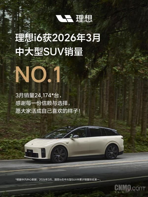 理想 i6 登顶 3 月中大型 SUV 销量第一单月销量超 2.4 万辆交付不到 7 个月,下线 10 万台智能评测四大维度全满分原厂流媒体后视镜二季度上线限时购车权益截止 4.303 年 0 息 + 多重豪华配置赠送