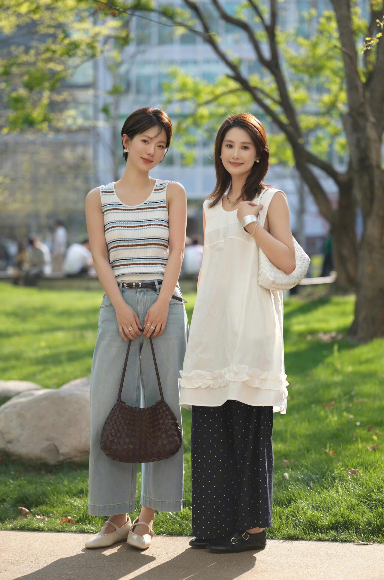 「闺蜜出街:一个辣得松弛,一个柔得舒展」 春天的风把松弛感吹到了身上, 她是条纹针织+阔腿牛仔的随性, 我是白衫波点裤的温柔舒展, 阳光刚好,搭子刚好,春天的松弛感也刚好。