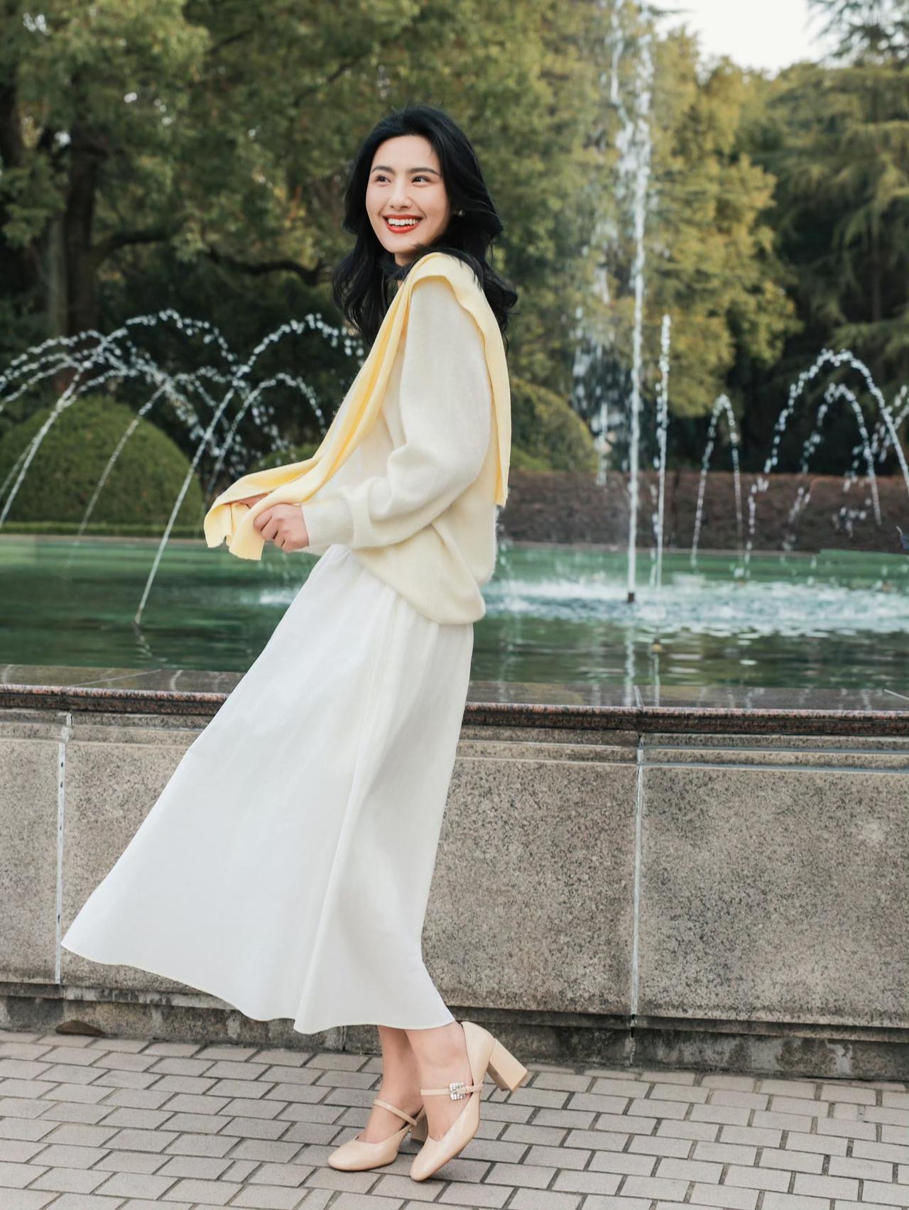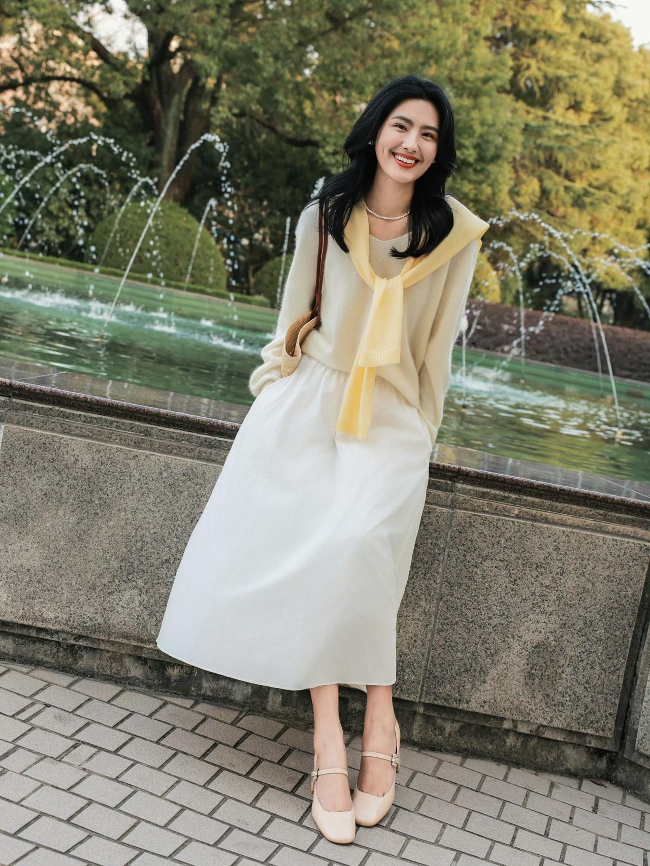 米白针织衫+鹅黄丝巾的搭配,像把春天的阳光裹在了身上,配上垂感满分的白色长裙,慵懒又精致;珍珠项链和浅口鞋的细节,让温柔里多了点优雅质感。