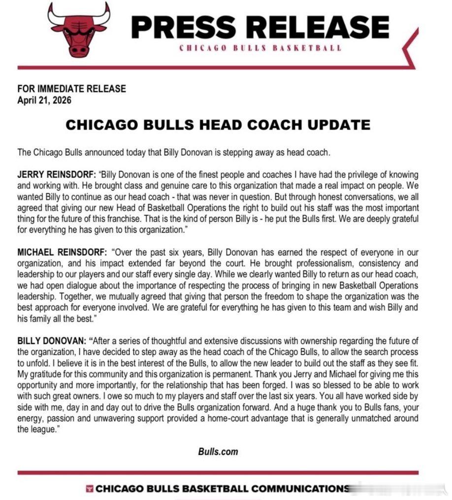 Shams:多诺万决定不再担任公牛主帅一职。公牛官方也发了公告。