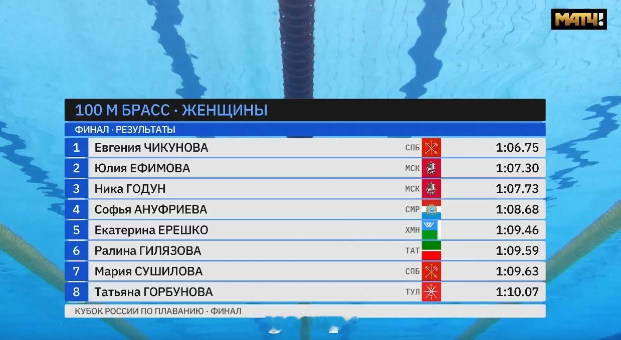俄罗斯游泳杯总决赛女100蛙决赛Chikunova1:06.75埃娃1:0
