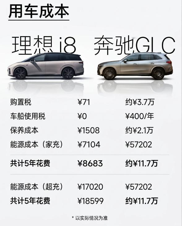 10 万公里用车成本对比!奔驰 GLC 对比理想差距太夸张 今天拿奔驰 GLC 260L 与理想 L8 做真实横向测算,全部按照家用标准计算:年均行驶 2 万公里,整整 5 年用车周期,结合日常综合路况,95 号汽油按 8.8 元 / L 计价,数据全程公平无偏袒。 🔋能源消耗费用 奔驰 GLC 260L 综合百公里油耗 10L,跑完 10 万公里累计油费88000 元 理想 L8 综合百公里电耗 16 度,家用低谷充电全程下来总电费仅4800 元; 即便全部公共快充充电,总费用也只有24000 元。 仅能耗这一项,两者最高相差83200 元。 🔧全程保养费用 奔驰 GLC 260L 全程 4S 店正规保养,10 万公里累计保养总花费28000 元 理想 L8 无传统发动机结构,无需更换机油机滤,仅基础检查与易损件更换,10 万公里总计5500 元 保养费用直接相差22500 元。 🛡️保险及后期维修杂费 奔驰 GLC 260L 5 年全程保险、杂项维修合计50000 元 理想 L8 5 年综合保险及用车杂费总计39500 元 此项差额10500 元。 💥最终总成本核算 奔驰 GLC 260L:10 万公里全部用车开销合计166000 元 理想 L8(家充版):全程总花费仅49800 元 两者整整相差近 12 万元! 即便扣除两车 5 年二手车残值 3 万元差价,长期开下来依旧能省下巨额用车成本。 不细算完全没概念,豪华油车和增程新能源的养车差距远比想象更大。 换作是你,你会选传统豪华品牌燃油车,还是高性价比新能源?【来自懂车帝车友圈】