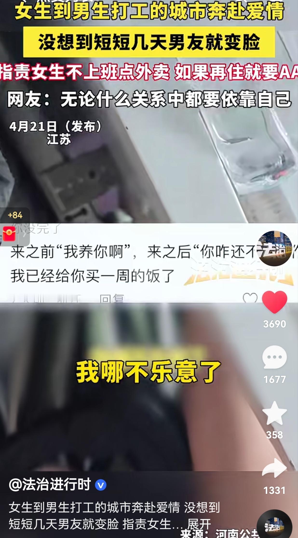 奔着“我养你”奔赴爱情,结果刚到第4天就被催AA房租。 真的服了,现在有些男人画大饼的速度,比翻书还快。 江苏这个女生,被男友一句“来南方找工作,我给你兜底”骗得晕头转向,打包行李就奔赴爱情。 她以为自己找到了那个能给她托底的人,结果呢?刚到男友打工的城市,连一周都没待满,就被催着找工作、AA房租,变脸速度快到她直接懵了。 她在视频里说,来之前男友说得比谁都好听,让她放心过来,南方工作机会多,他会给她兜底。 可她刚到第4天,男友就开始阴阳怪气:“你怎么还不找工作?一天到晚就躺着刷手机?” 连给她买了一周的外卖,都成了他甩脸子的理由,他理直气壮地抱怨:“我都给你买了一周的饭了,钱都花没了!” 还放话“再住下去,房租就得AA”,就差直接把她赶出门了。 女生拿行李要走,想试探他的反应,结果男友连看都不看一眼,只顾着打游戏。 她委屈地问:“我花你多少钱了?我是花你钱了吗?” 男友直接怼回来:“那不是花我钱?吃饭钱不都是我买的?”这话说得,好像花了一周的饭钱,就成了天大的恩情,他就可以理直气壮地翻脸了,还喊着“已经受不了了”,嫌她住得久。 网友看到后评论说:“有句话说得好,要找个能看得惯你闲的人,还没结婚都这样,结婚了还得了?” 也有的网友说:“这哪是谈恋爱,分明是找个免费保姆,连一周饭钱都要算得清清楚楚!” 还有的网友说:“我养你的保质期,原来只有4天?这饼画得,连渣都不剩!” 更有网友表示:“女生真的别再为了男人奔赴异地了,你赌上全部,人家连一顿饭的付出都觉得亏!” 我看完真的又气又寒心。当然不是所有男生都这样,但这种拎不清、没担当的男人,真的太让人下头。 女生放弃熟悉的环境,带着满心期待奔赴爱情,不是来当别人的免费饭票,也不是来被催着找工作、被嫌弃“吃闲饭”的。 她信了那句“我养你”,结果人家只养了她4天,连一顿15块的外卖都要斤斤计较,这种感情,到底有几分真心? 说白了,有些男人的“我养你”,就是一句廉价的哄骗。他根本没打算养你,只是想让你过来陪他,顺便帮他分担房租、分担生活压力。 等你真的来了,他就开始各种挑刺、甩脸子,逼你自己受不了走,还能落个“是你自己走的,不是我赶你”的美名。 爱情里最恶心的,就是这种画大饼式的承诺。承诺的时候说得天花乱坠,真要付出的时候,却连一顿饭钱都舍不得。 他让你放弃一切奔赴他,却连最基本的尊重和包容都做不到,这种男人,根本不配谈爱。 女生们真的要清醒一点,别再为了男人放弃自己的生活、自己的工作了。 靠谁都不如靠自己,你自己有工作、有收入,不用看别人脸色吃饭,才是最大的底气。 别让一时的甜言蜜语,冲昏了你的头脑。真正的爱,不是嘴上的承诺,而是实实在在的行动,是哪怕你暂时没有收入,他也愿意给你时间,而不是催着你找工作、跟你算得清清楚楚。 别再为一句甜言蜜语赌上全部,爱你的人不会让你委屈,算计你的人不值得你奔赴。 别拿自己的人生,去赌别人随口的一句承诺;真正的底气,从来不是别人给的,而是你自己挣来的。