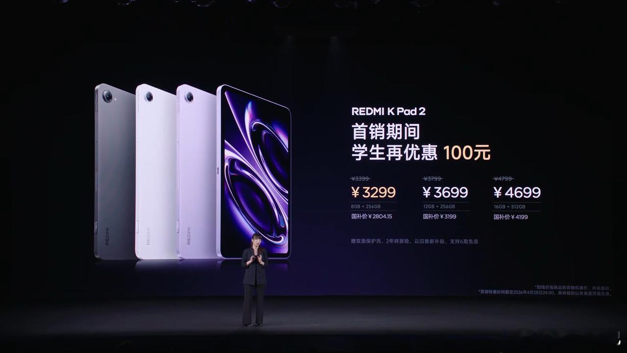 红米性能小平板 K Pad 2 首销 3399 元起,28 号之前学生再减 100 块,3299 元起