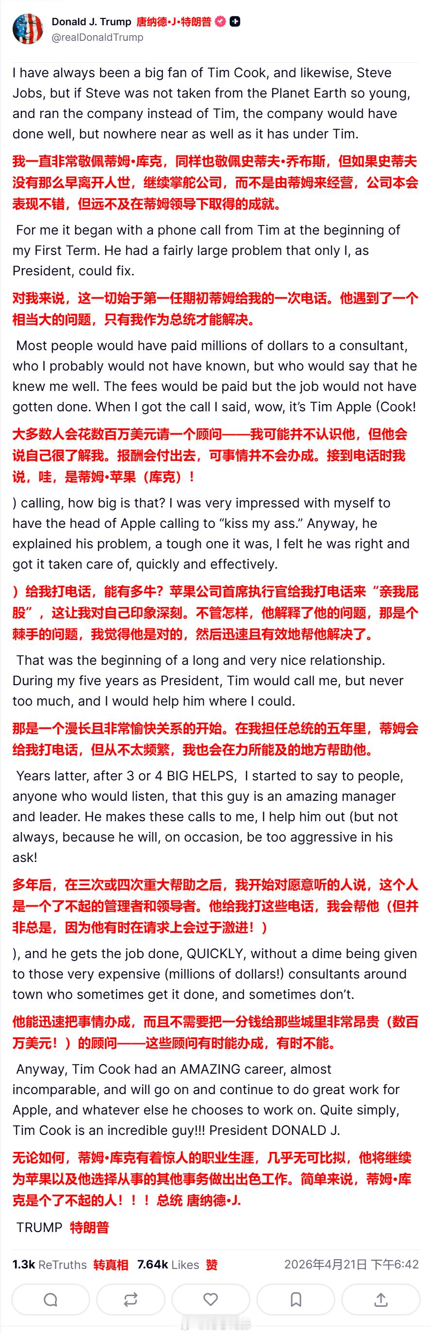 库克不再担任苹果CEO 特朗普发帖称,自己一直是苹果CEO库克的忠实粉丝:“当苹果公司的掌门人打电话来‘亲我屁股’时(kiss my ass),我对自己真是佩服得五体投地。”