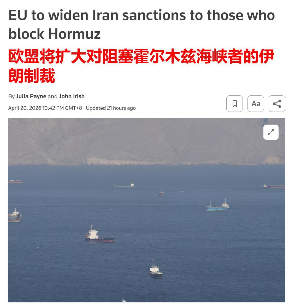 两名欧盟外交官表示,欧盟将扩大对伊朗制裁的适用范围,将那些对封锁霍尔木兹海峡负有责任的主体纳入制裁对象——不包括美国。