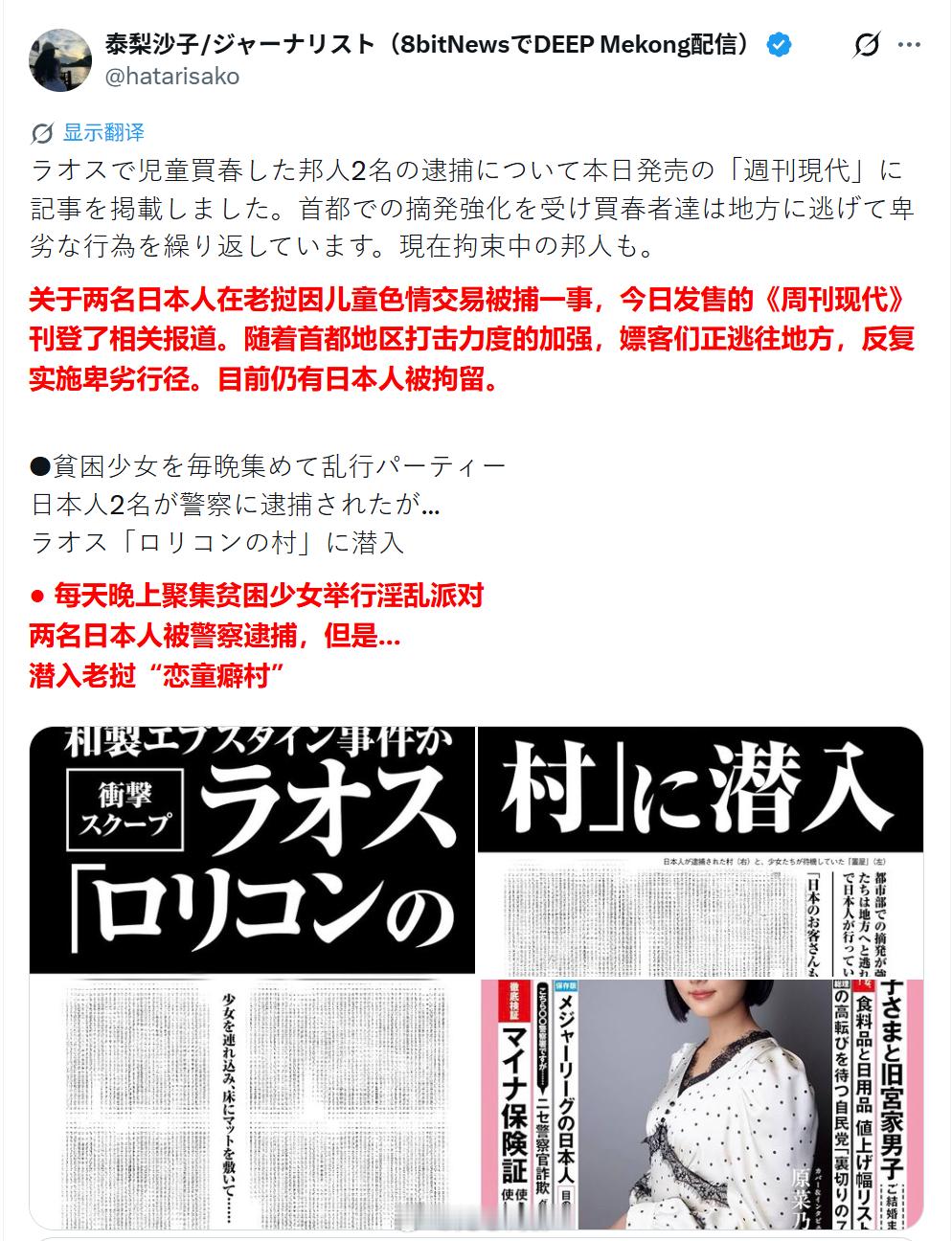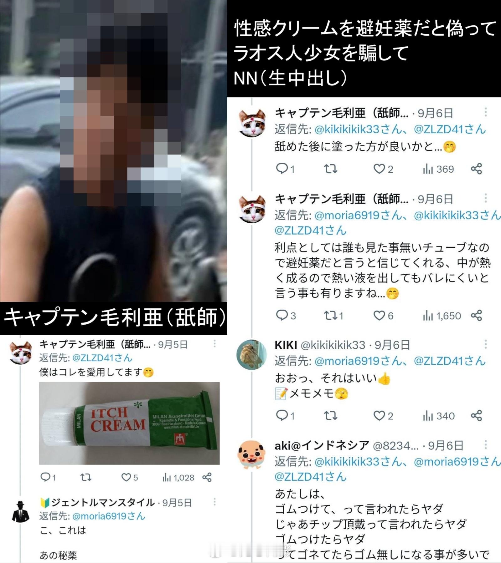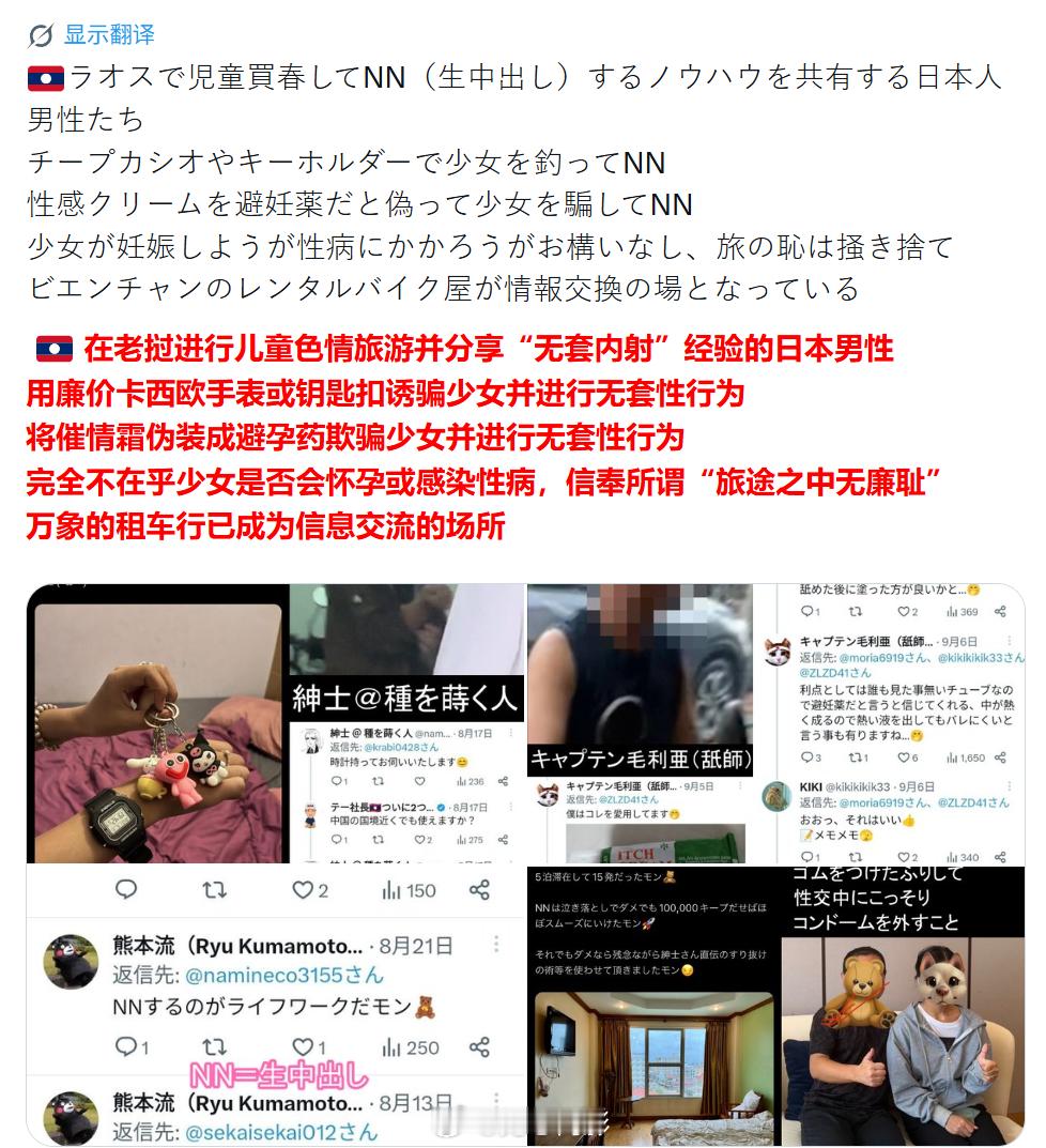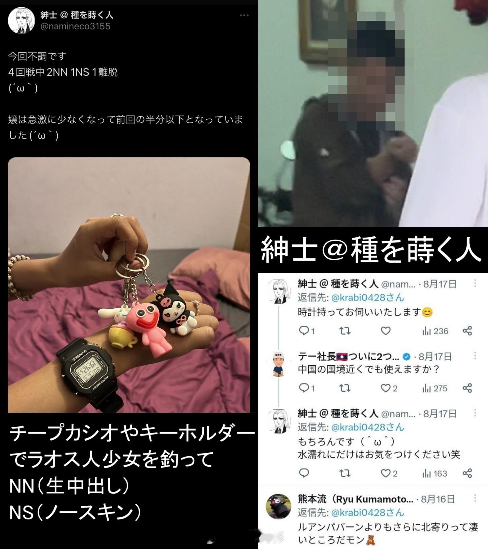 日本人在老挝涉及儿童色情交易一事还在不断有新内容曝光,真TM恶心透了。此前有50岁的日本人望月耐生,在老挝首都万象经营摩托车租赁店(其实租车行骗来不少未成年少女进行性交易)。他以老挝有处女出售为噱头进行宣传,吸引日本恋童癖者前往老挝。望月声还称自己也从妓院“赎身”了一名 16 岁的老挝少女并与其建立恋人关系,甚至还以“希望资助该少女”为由募集捐款。现在又爆出,这群以租车行为幌子,进行未成年人性交易的日本人,用廉价卡西欧手表或钥匙扣诱骗未成年少女并进行无套性行为。甚至将催情霜伪装成避孕药欺骗少女并进行无套性行为。完全不在乎少女是否会怀孕或感染性病。