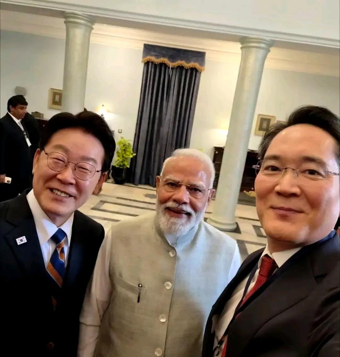韩国三星会长李在镕参加印度总理举办的午餐会上, 和总统李在明以及莫迪的自拍合影。 李在镕饶有兴致地拿起印度生产的新一代Galaxy ZFlip7,拍下了这张珍贵照片,他们仨精神头都很好,笑容满面。 而李在镕现在绝对是李在明身边的大红人,出国访问必须带上他,因为老李是韩国经济的命脉,举足轻重。今日话题