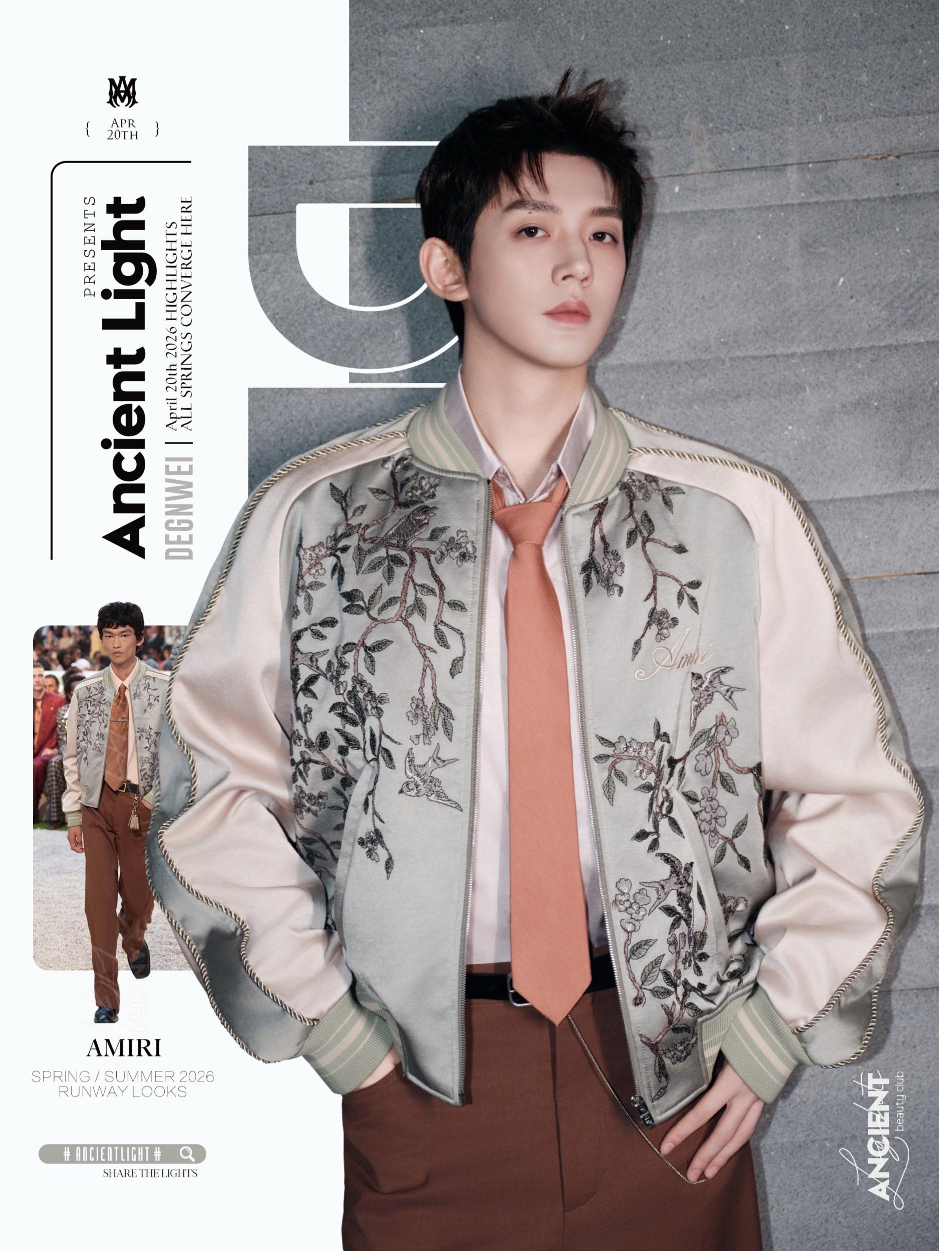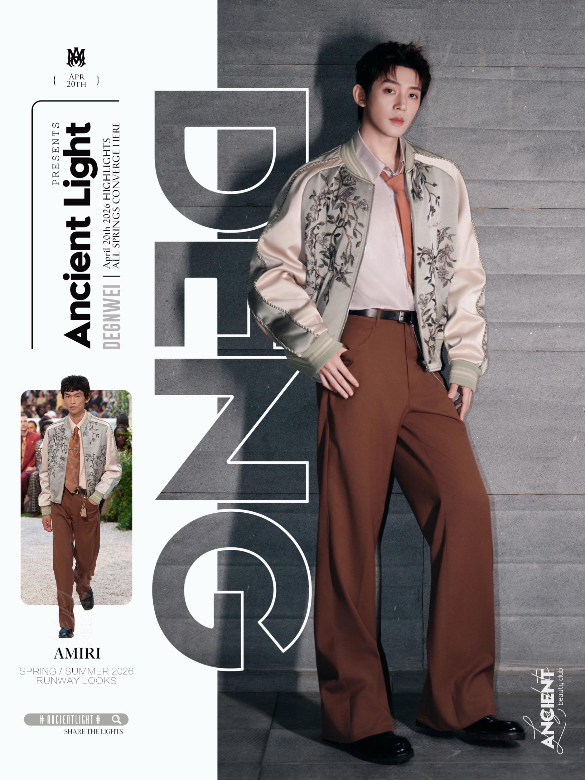 邓为这组· 被他穿出了另一种可能 这组造型在他身上落得格外妥帖。香槟色与浅绿拼接,花叶刺绣不是喧哗的装饰,是暗调里长出的春意。棕调领带压住轻盈,长裤的垂坠刚好托住上半身的松弛。没有刻意扮酷,那种雅痞和贵气是骨子里的。像老电影里走出来的人,只是恰好穿了这一季。