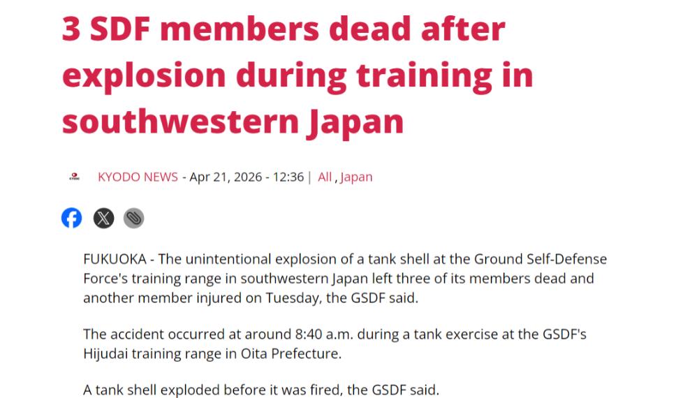 就在刚刚, 日本自卫队3名队员被炸身亡,高市早苗遭重创。 日本陆上自卫队今天证实(4月21日),在日本西南部陆上自卫队训练场发生的一起坦克炮弹意外爆炸事故中,三名自卫队成员被炸死亡,另有一名成员受重伤。 麻烦看官老爷们右上角点击一下“关注”,既方便您进行讨论和分享,又能给您带来不一样的参与感,感谢您的支持! 一声巨响划破日本西南部的宁静,4月21日下午,陆上自卫队训练场突发坦克炮弹爆炸,3名队员当场被炸身亡、1人重伤,现场残骸飞溅触目惊心。 没人能想到,这场惨烈的意外,竟与高市早苗政府当天的两大动作撞个正着,三件事连环发生,每一件都透着不寻常的诡异与凶险。 据日本陆上自卫队官方通报,事故发生在熊本县的陆上自卫队久住驻屯地训练场,出事的是一辆10式主战坦克,炮弹在装填过程中意外引爆。 现场目击者称,爆炸瞬间火光冲天,浓烟滚滚,坦克炮塔被冲击波掀飞数米远,受伤队员浑身是血,被紧急送往附近医院抢救却仍生命垂危。 更让人唏嘘的是,出事的3名队员均为经验丰富的现役队员,此次事故系装备操作相关意外,原本可通过规范流程规避。 就在爆炸事故发生当天,高市早苗政府正式敲定修改“防卫装备转移三原则”,彻底打破禁忌,批准向海外出口杀伤性武器。 要知道,这一原则自1967年确立以来,一直禁止日本出口杀伤性武器,此次修改相当于彻底撕毁和平承诺,沦为递向战争的“投名状”。 更过分的是,同一天上午,高市早苗以“内阁总理大臣”的名义,悄悄向靖国神社供奉了“真榊”祭品,公然祭拜甲级战犯,挑衅周边受害国家。 三件事看似毫无关联,实则环环相扣,高市早苗一边解禁武器出口扩军备战,一边祭拜战犯煽动民族主义,自卫队却突发事故自食恶果。 有分析指出,此次坦克炮弹爆炸绝非偶然,近期日本自卫队频繁开展高强度训练,为配合武器出口计划盲目提升战备,早已埋下安全隐患。 事实上,这不是日本自卫队第一次出事故,近期曾有F-15战斗机坠毁、护卫舰触礁等事件发生,装备老化、训练仓促问题早已暴露。 高市早苗上台后,一直推行“军事扩张”路线,计划将防卫预算提升至GDP的2%,还与美国、澳大利亚勾结,试图打造“反华包围圈”。 此次修改“防卫装备转移三原则”,目的就是为了向相关国家出口武器,既赚军火钱,又拉拢盟友,进一步搅动亚太局势。 而向靖国神社供奉祭品,更是其讨好右翼势力的手段,试图美化侵略历史,煽动国内极端民族情绪,为军事扩张铺路。 放眼当下国际局势,俄乌冲突陷入僵局,中东战火持续升温,高市早苗此时解禁武器出口,无疑是在给全球动荡“火上浇油”。 更值得警惕的是,日本近期频繁在台海问题上指手画脚,勾结美国在周边开展联合军演,此次军事动作升级,对亚太和平稳定构成严重威胁。 事故发生后,日本国内一片哗然,反对党纷纷指责高市早苗政府只顾扩军备战,忽视自卫队装备维护和人员安全,民众抗议声此起彼伏。 有日本媒体评论,这场爆炸事故是“上天的警告”,提醒日本停止军事扩张,否则只会重蹈历史覆辙,给本国和周边国家带来灾难。 更致命的是,此次事故直接重创高市早苗的支持率,原本就有所波动的民调再降5个百分点,其推动的军事扩张计划也面临搁浅风险。 要知道,高市早苗原本计划通过扩军和武器出口巩固政权,如今自卫队出重大事故,解禁政策遭民众反对,可谓腹背受敌、雪上加霜。 从历史来看,日本一旦走上军事扩张道路,必然会给亚洲各国带来创伤,此次三件事叠加,无疑是一个危险的信号,值得全球警惕。 目前,日本陆上自卫队已成立专项调查组,调查事故原因,但无论结果如何,都改变不了高市早苗政府破坏和平的本质。 在全球呼吁和平的当下,高市早苗的一系列动作,不仅遭到本国民众反对,也引发周边国家强烈不满,最终只会自食恶果、众叛亲离。
