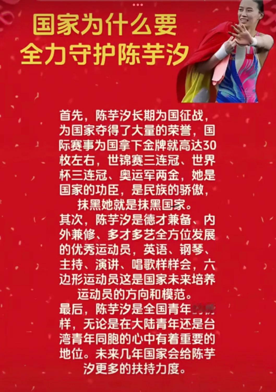 为什么国家力挺陈芋汐? 因为她不仅是德智体美劳 全面发展的杰出代表, 更是国家急需的顶尖人才! 作为最争气的运动员, 陈芋汐以卓越表现 被世界泳联 正式树为10米台全球标杆一一 这不仅是个人荣耀, 更是中国跳水实力的象征!