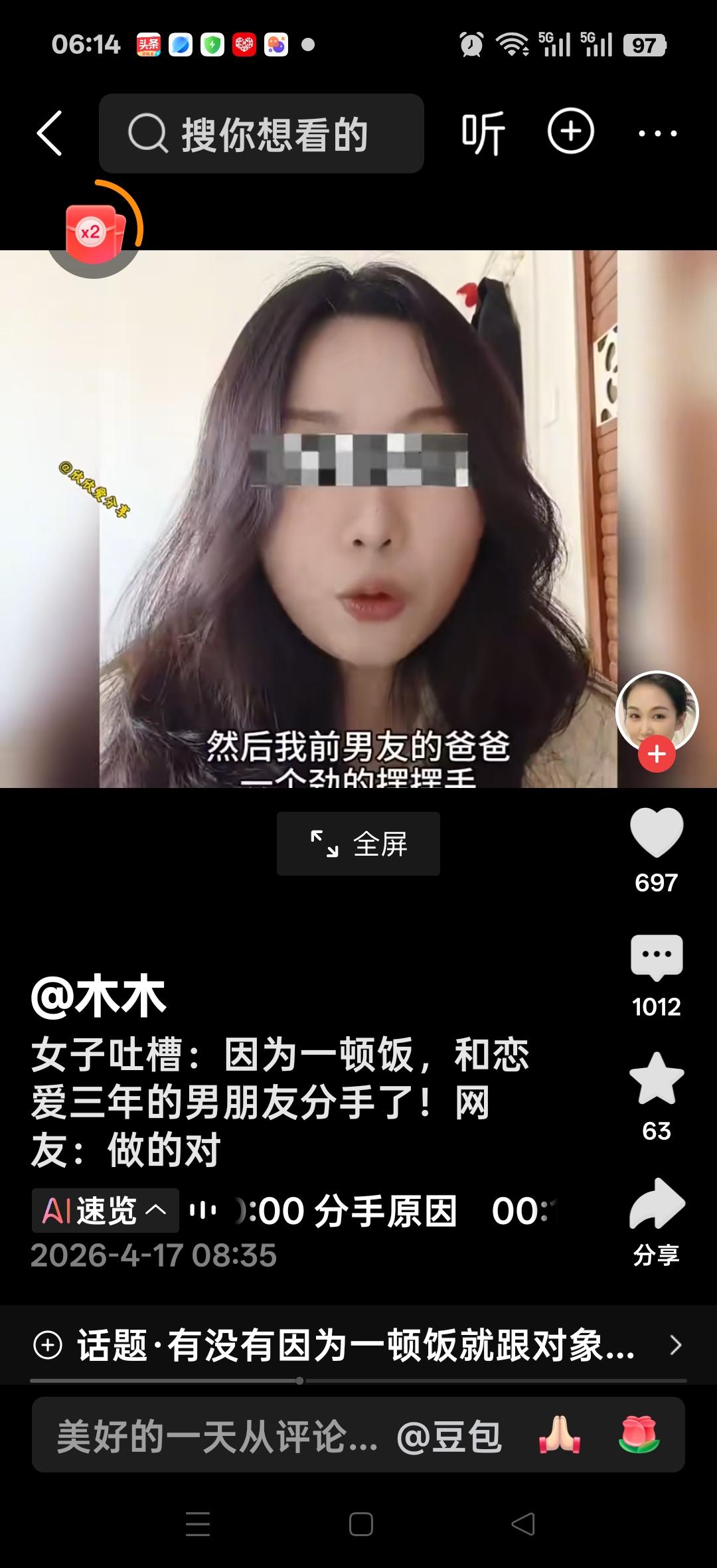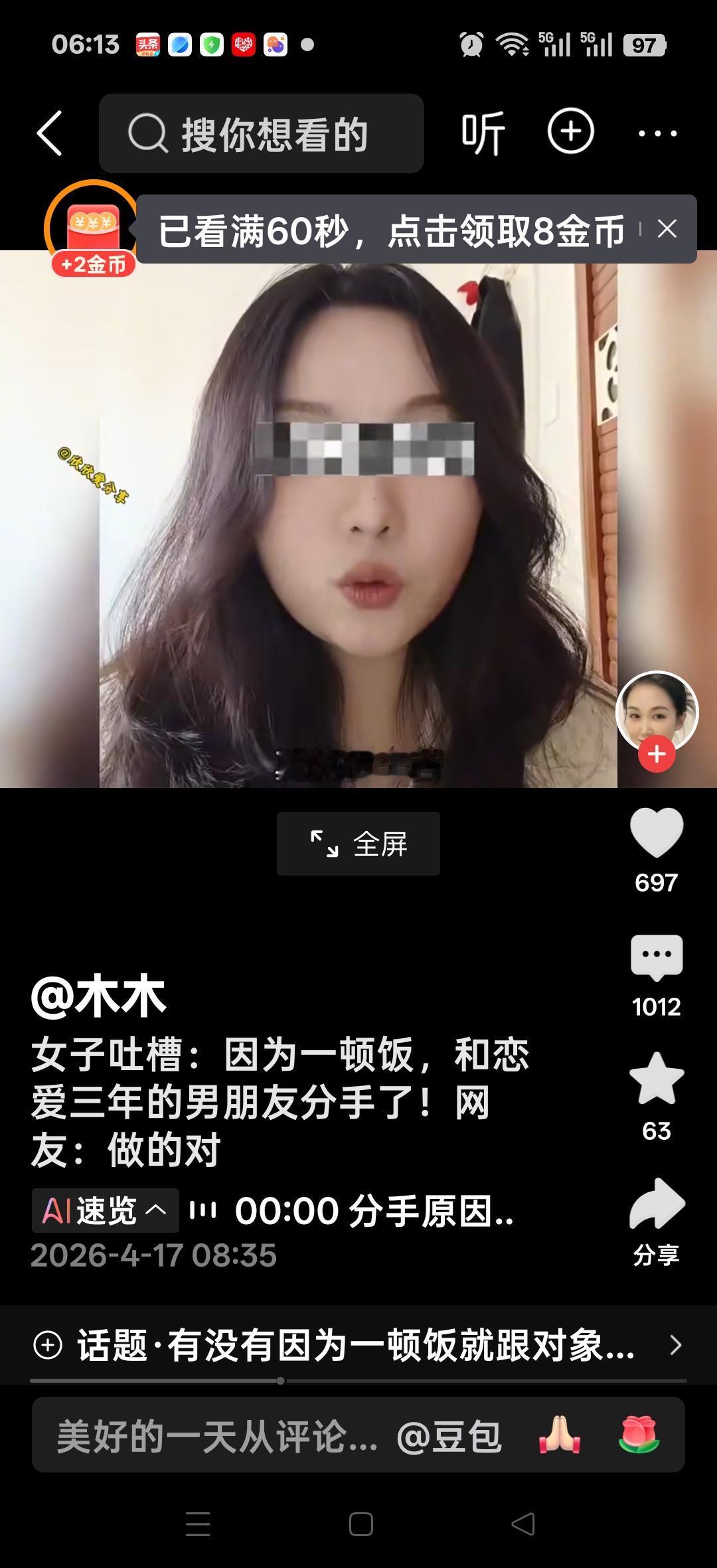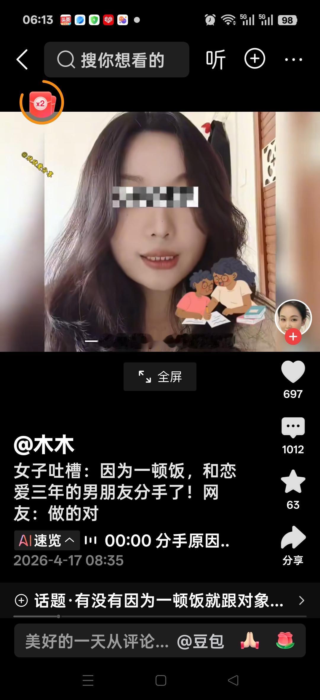 女子吐槽:因为一顿饭和恋爱三年的男朋友分手了,他爸大男子主义什么都不干,他妈忙里忙外伺候着,一家三口……。网友说:如果女孩有家庭教养,都恋爱三年了,这个时候应该主动帮助婆婆干点家务了。有的人说:此女说的道理,一套一套的,其实心里就是不愿意为家庭多付出,甚至自己孩子都不愿意服务,多干点家务就会计较分的太清,不适合过日子,适合合伙开公司!有的人说:妹妹你长了八个心眼儿,你真的留不得,该庆幸的是你男朋友。有的人说:你绝对不是一个开朗心胸豁达的人,如果是我会主动带男朋友一起帮忙,你考虑的是他的家庭状况和负担。无法共情,你和你的男朋友分手是对的,你们的三观不一致!大家说这样的吗?