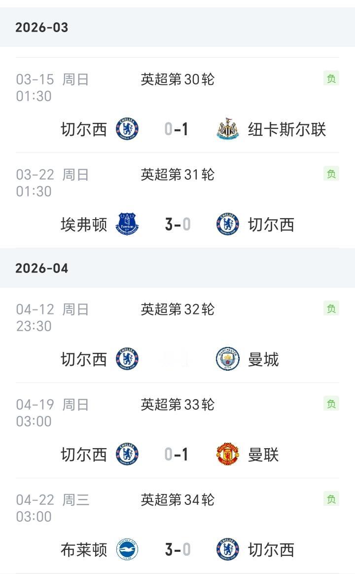 切尔西在0-3惨败给布莱顿之后英超的比赛已经五连败了,而且是五场比赛零进球!有三场比赛丢球在3个。这种比赛情况即便是前几年印象中最为困难的车子也没有出现这种情况。 其实切尔西赛季初表现出的即战力还是不错的,但随着赛季深入切尔西越来越完蛋。伦敦的另外两支球队阿森纳在巨大优势的情况下现在冠军很可能不保,而热刺在2026年的今天甚至在为保级而战。伦敦的这三支球队确实是为球迷做了一桌大席!!!