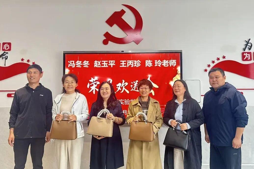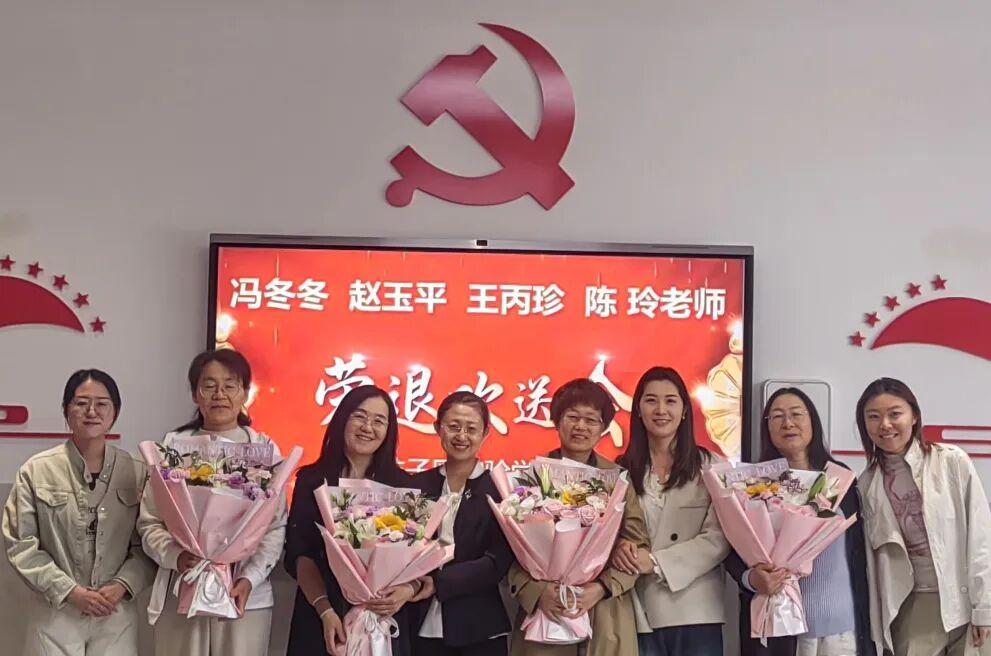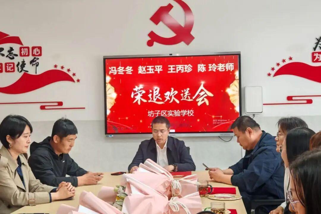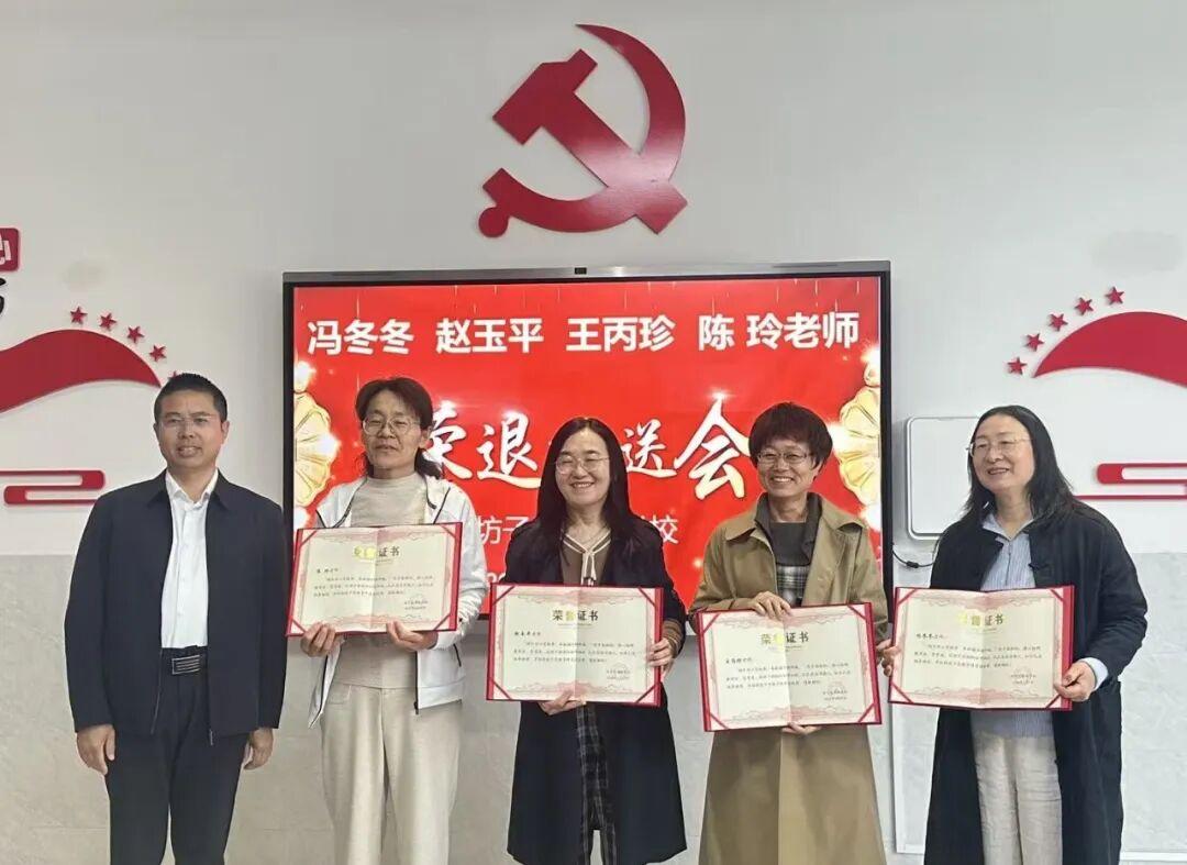 潍坊市坊子区实验学校冯冬冬、赵玉平、王丙珍、陈玲四位老师荣退欢送仪式 4月21日举行,工会主席代吉娥主持,刘元文校长颁发荣誉证书,王亮副校长、王禧东书记为荣退教师送上暖心幸福礼包,王子君、刘晓蕾副校长颁发光荣退休纪念奖牌,优秀青年教师代表杨雪瑶、胡海燕、张琳、王嘉宇老师为四位恩师献花。