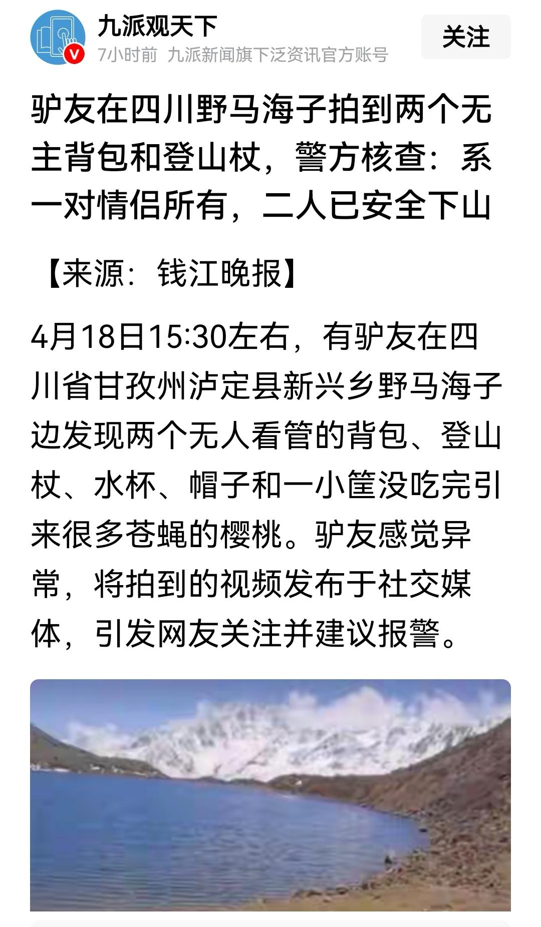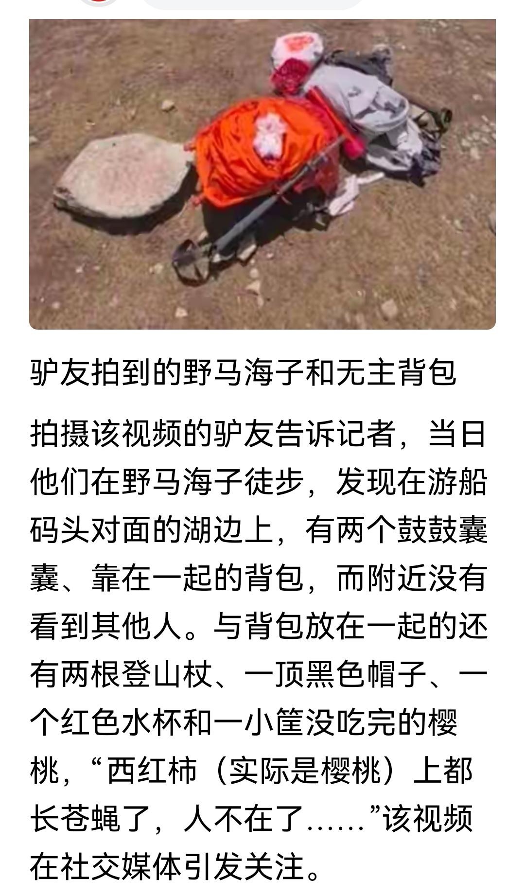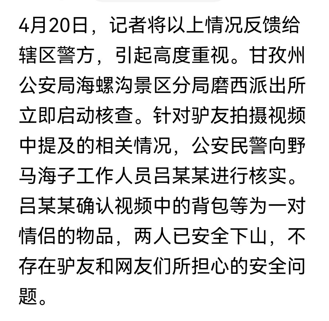 警方的这个回应,还不够清楚,有很多疑点!警方仅仅是向野马海子工作人员吕某某进行了核实,并没有找到这对情侣,进行确认,也没有其他证据证明,这对情侣已经下山,吕某某说的是不是实话?这个事情很反常,这对情侣为什么把包扔在湖边,不要了?自己空手下山?他们发生了什么事情?吕某某知道情侣已经下山,为什么不把包收起来?这对情侣出来游玩,把自己带的东西都扔掉,然后自己空手下山了,这样的事情闻所未闻,极不正常!即使,是真的,吕某某为什么不制止?平时一个塑料袋,一个空瓶子都不能扔在山上,情侣把东西全扔在山上,工作人员应该制止啊!警方这么处理案子,漏洞太多!起码,应该找到情侣本人,核实一下,问问到底发生了什么事情?