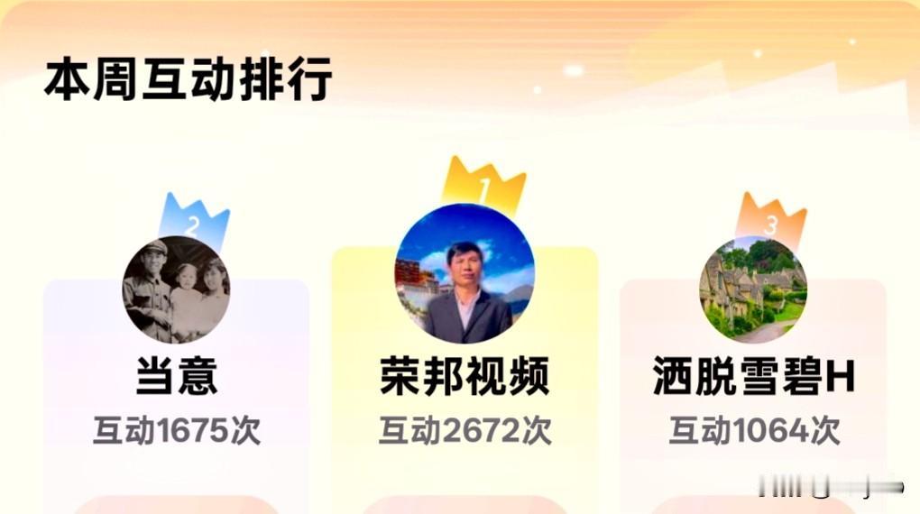 今日头条周报(2026.4.13-2026.4.19)互动排行揭晓啦!上周与我互动前十名的网友是(1)@荣邦视频 2672次,(2)@当意 1675次,(3)@洒脱雪碧H 1064次,(4)@沉着咖啡木子 1008次,(5)@丹琳 929次,(6)@勇敢的钢琴No二哥 748次,(7)@项堃走中国 651次,(8)@卉卉的旅行日记626次,(9)@因为欢乐而美好 523次,(10)@绯语真相馆 469次。在头条上相遇即是缘,感恩遇见,感谢你们! 头条上有你们的陪伴,让我快乐无比哦! 非常感谢与我互动的前十名网友,珍惜缘分,让我们继续携手同行,一起努力,加油!