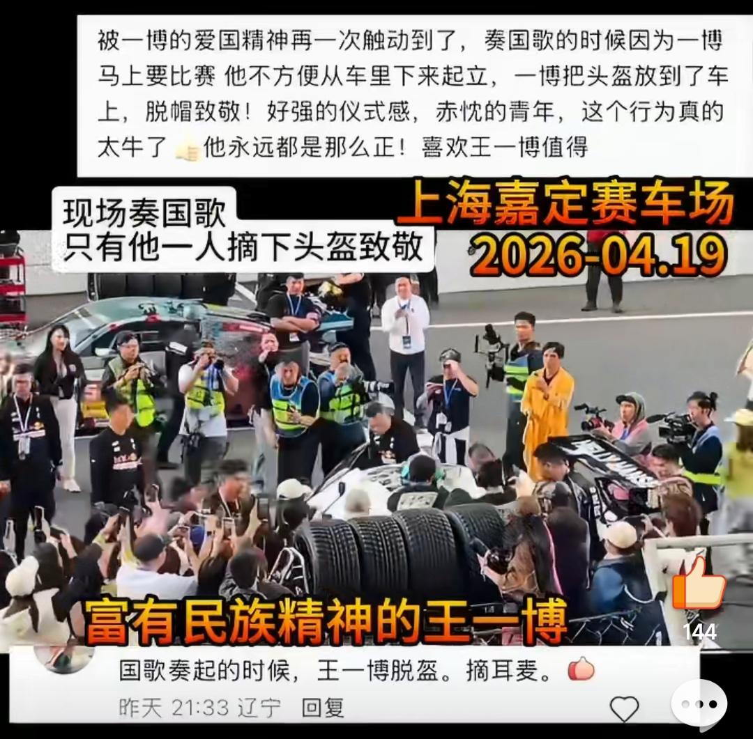 又刷到这一幕了! 很遗憾直播的时候我在医院,刷视频看到这一幕,端着手机看了好几遍,内心远比赛事还震撼,视频显示,全场选手只有他一人有这种下意识的行为动作,这完全是刻在骨子里的富有民族精神的爱国情怀,我的眼前立刻浮现一手举起火炬一手拾起国之尊严,耐克解约穿着拖鞋走出宾馆……一幕幕一桩桩一件件,王一博一个字:正![赞][赞][得意][得意]王一博