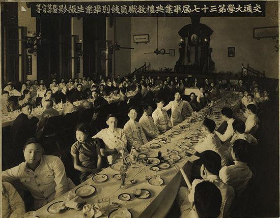 这是民国时期交通大学第37届毕业典礼全体在校教职员工、本届毕业学子齐聚一堂,举办毕业盛典与官方纪念宴会的老照片。 顶部横幅文字:交通大學第三十七屆畢業典禮 教職員暨畢業生 攝影紀念 场地为校内大型礼堂厅堂,高挑开阔的室内空间、立柱回廊、复古吊扇、墙面匾额、后方二层挑空楼座,庄重典雅。全场排布超长贯通西式长桌宴,桌面铺纯白桌布,规整摆放全套西餐盘盏、杯碟、花艺餐具,沿用近代西式正式宴会规制,是民国顶尖高校高端正式宴会的完整格式。满场座无虚席,前排至后排层层坐满全体师生。 作为近代华夏工科第一学府,百年文脉源远流长,为国铸就万千实业栋梁。一场毕业盛宴,一届青春别序,少年辞别校园,赴以实业兴邦。一帧百年旧影,封存民国高等教育鼎盛岁月里,交大独有的儒雅学府风华。