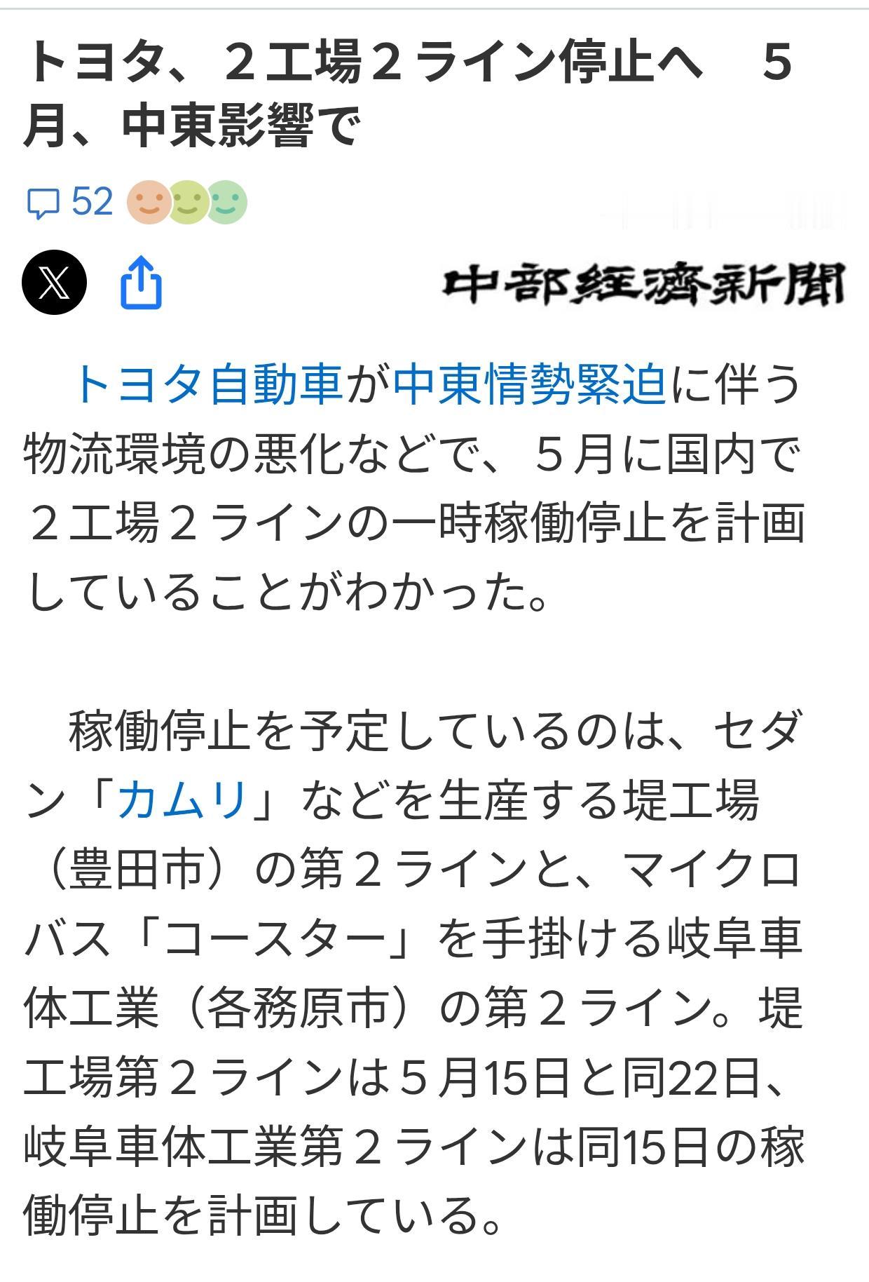 丰田因中东局势凯美瑞考斯特将停产 日媒《中部经济新闻》4月22日报道:因中东局势紧张导致物流环境恶化,丰田汽车计划五月暂停日本境内两家工厂两条生产线的生产。 堤工厂(丰田市)生产凯美瑞轿车的第二线,以及负责中型巴士“考斯特”的岐阜汽车车身工业(各務原市市)的第二线,计划暂停运营。 堤工厂的第二线计划于5月15日和22日停止,岐阜汽车车身工业的第二线计划于15日暂停运营。 丰田计划在3月~4月减少约44,000辆国内产量,以应对中东因美国和以色列对伊朗的攻击引发的紧张局势。 今年四月,有消息披露了四家日本国内工厂和五条产线的临时停运,对出口车辆目的地位置的审查后,预计五月国内产线停产的影响将有所缓解。 关于海外生产,公司决定在5月至11月间在亚洲及其他国家减少约38,000辆产量。 日本车企停产 丰田日本 头号新车 丰田 日本 我要上精选-全民写作大赛 头号创作者激励计划 汽车