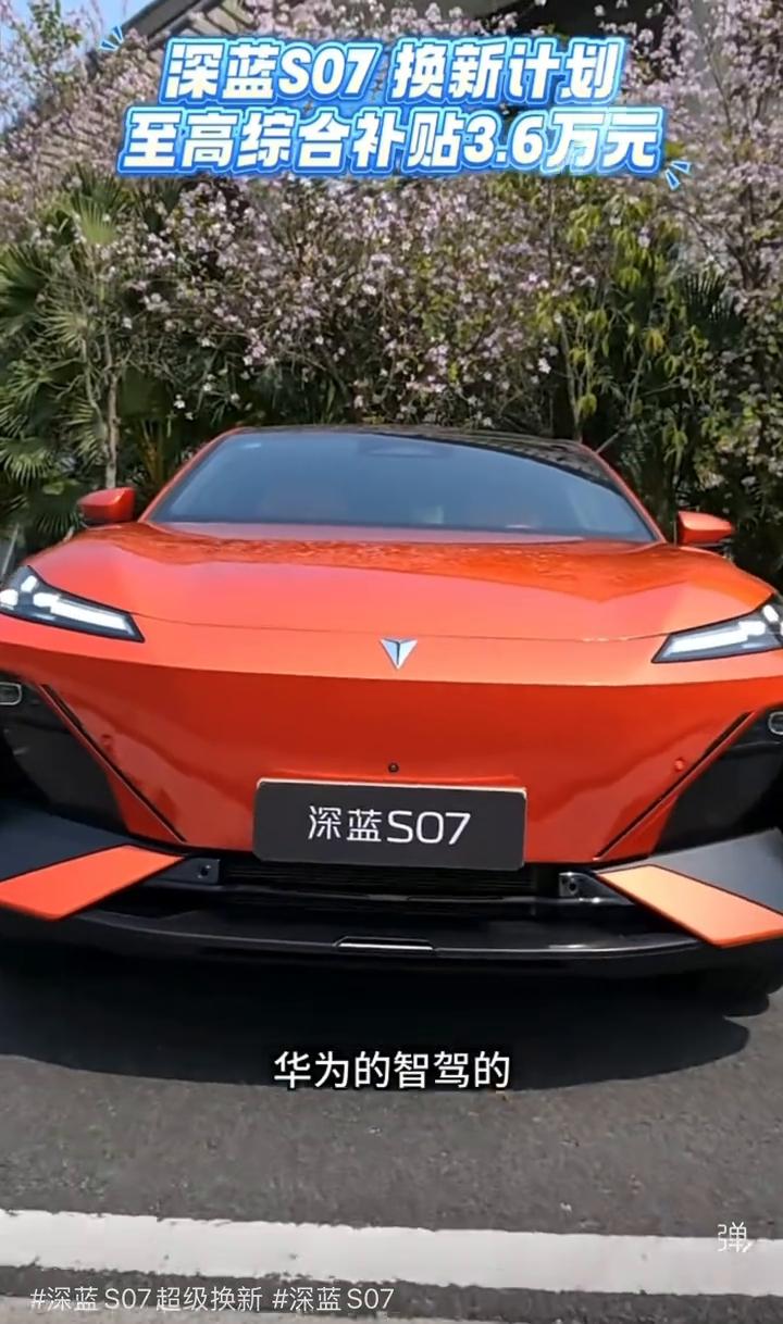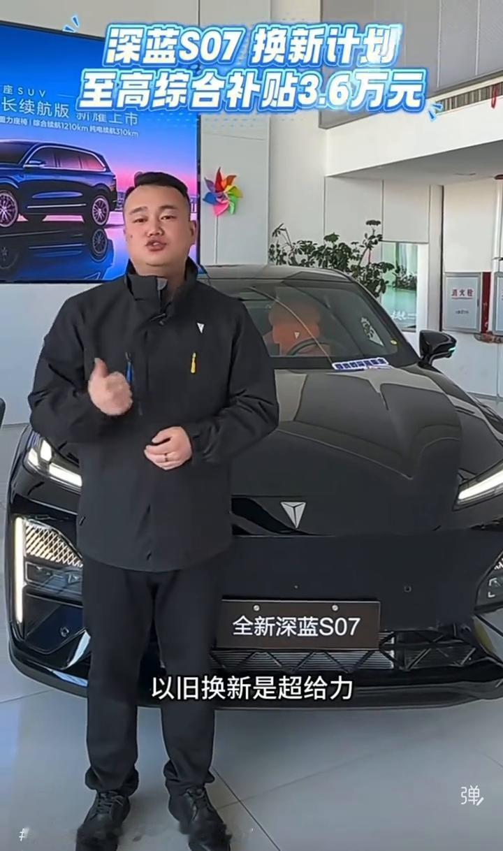 深蓝S07换新计划,至高综合补贴3.6万元。 旧车别再将就,深蓝S07换新计划,以旧换新是超给力。任何品牌的旧车置换最高优惠3.6万元,综合的补贴。纯电的、增程的,俩版本纯电有630公里续航,增程有1385。华为的试驾的,SFD的悬架,大五座空间。家用旧车还保值,新车还优惠,现在换车相当优惠,正当时,干吧。