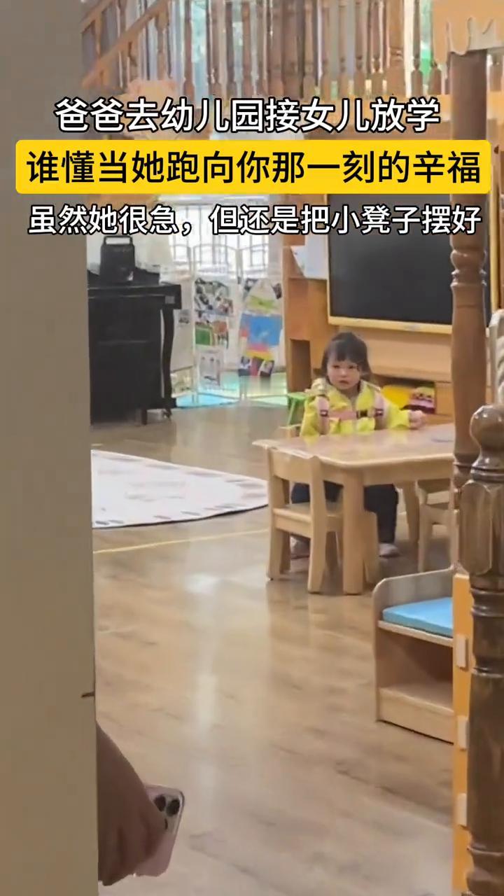爸爸去幼儿园接女儿放学,谁懂当她跑向你那一刻的辛酸?虽然她很急,但还是把小凳子摆好。