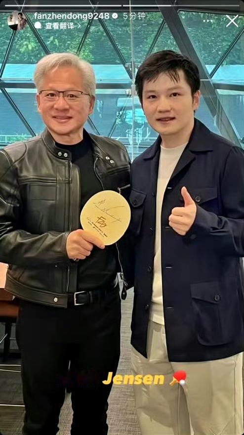 跨领域联动!樊振东与黄仁勋同框,体育与科技的碰撞 乒乓球世界冠军樊振东,与英伟达创始人黄仁勋同框合影。 照片中,樊振东向黄仁勋赠送了自己的签名球拍,两位不同领域的顶尖人物友好互动,展现了体育与科技领域的跨界交流。