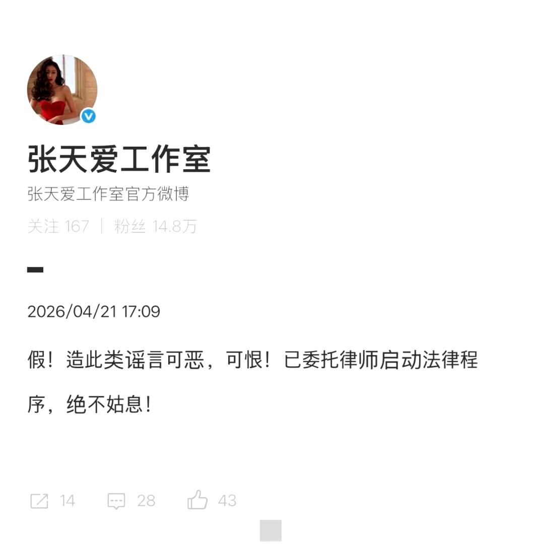 谣言有多无耻,张天爱就有多清醒!工作室的回应,给所有造谣者敲了警钟 网络不是法外之地,这句话在张天爱身上体现得淋漓尽致。 恶意编造的谣言,不仅是对她的恶意抹黑,更是对她职业和人格的践踏。面对这种伤害,张天爱工作室没有沉默,而是用最刚的态度回应:绝不姑息! 那些躲在屏幕后面造谣的人,以为能靠虚假信息带节奏,却忘了造谣也要付出代价。张天爱的回应,也是在告诉所有人:面对恶意,沉默从来不是唯一的答案,拿起法律武器,才能让谣言无处藏身。