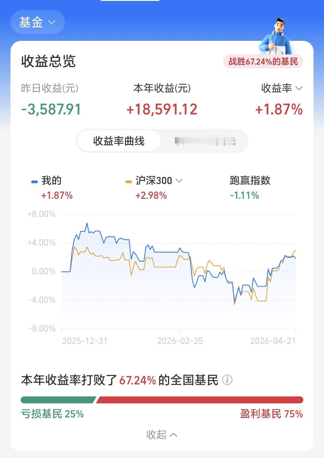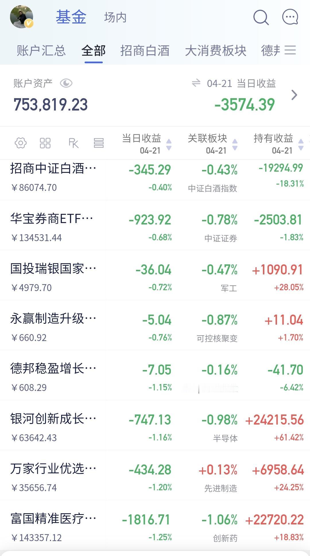 基金:市场很快就要进行方向选择 昨天基金亏损3556元,基金持有761286元,现金持有1232384元,资产总额1993671元,还是在小幅度波动当中。 本周有了两个交易日,一亏一盈,一个交易日亏损,一个交易日盈利,周亏损1469元。 本月有了14个交易日,五亏九赢,五个交易日亏损,九个交易日盈利,月收益46870元。 今年以来收益18591元,收益率1.87%跑赢了全国67.24%的基民,跑输了沪深300指数2.98%的上涨幅度。 近一年以来收益424918元,收益率31.60%,跑赢了沪深300指数25.97%的上涨幅度。 持有的基金中,昨天晚上净值更新以后,上涨幅度最大的三个板块是:新能源汽车板块,5G板块,创业板指,下跌幅度最大的三个板块是:创新药板块,先进制造板块,芯片半导体板块。 欧洲市场昨天晚上下跌,德国下跌了0.60%,英国下跌了1.05%,法国下跌了1.14%,下跌幅度都不是很大。 美股市场昨天晚上也是下跌,纳斯达克指数下跌了0.59%,道琼斯指数下跌了0.59%,标普指数下跌了0.63%,下跌幅度都很小。 今天的市场受消息面的影响会很大,美国宣布无限期延长停火期限,有人误以为无限期就是很长时间,其实,无限期就是时间不确定,可以是一天,可以是很长时间。美国人这样宣布的目的是,究竟延长临时停火时间多长的主动权在他们手里面。 继续维持临时停火对美国人是有利的,对伊朗人是没有好处的,美国人可以利用这样的时间进行重新军事部署和武器弹药的补充,但在被美国人外围封锁霍尔木兹海峡的情况之下,伊朗人的原油运不出去,伊朗人就没有收入,伊朗人的生活物质品运不进来,伊朗人的生活就会受影响,这样的局面肯定要被打破,究竟是被继续和谈打破,还是用武力来进行打破,现在并不能确定,我觉得继续和谈的可能性更大,你觉得是继续和谈的可能性大,还是继续武力的可能性大? 现在,日本和韩国已经开始,他们都是小跌状态中,日本下跌了0.26%,韩国下跌了0.20%,这样的话,我们的市场今天也会低开,但低开的幅度不会大。 今天资金估计会继续观望,直到有确定性的消息出现,我们还是要继续观察成交量,继续观察抱团板块能不能继续上涨,以及抱团板块下跌的时候,其他板块的涨跌情况。 再看一下下面的截图12,这是上证指数走势预演图,现在还没有远离4000点附近,也就是还没有进行真正的方向选择,但时间已经不多了,已经很快就要到选择的时间了,如果跌破五天线,就有向下选择的可能性,只要能够保持在五天线之上,就是没有进行方向选择,向上和往下都有可能性,你觉得是向上的可能性大,还是往下的可能性大? 大家帮忙评论点赞,转发和分享,谢谢大家的支持。