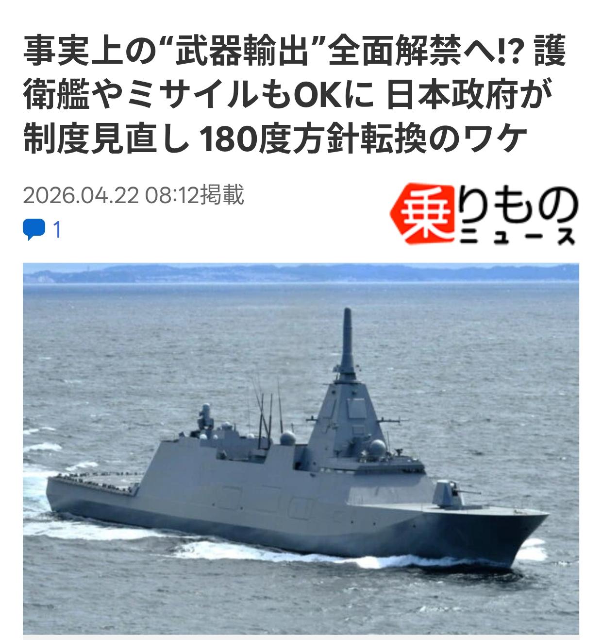 日本全面解禁杀伤性武器出口 2026年4月21日,日本政府宣布将对武器装备出口体系进行根本性转向,实行事实上的“武器出口许可”制度。 在旧制度下,武器和防务装备的出口仅限于五类:救援、运输、警戒、监视和扫雷。 因此,原则上不允许出口战斗机、护卫舰、潜艇和导弹等杀伤性武器。 现在“5种武器限制”将被废除。 因此包括战斗机、护卫舰和潜艇外,零部件和技术,以及维修和保养等服务,原则上都可以转移到海外。 日本政府称:通过与盟友及友好国家共享装备来加强威慑。 目标是利用武器装备的互通性深化安全领域的合作。 另一个是通过出口维持国内国防工业基础。 预计出口将支持生产和技术基础,而仅靠国内需求难以维持。 另一方面,对于所谓具有致命和破坏能力的“武器”,出口目的地将限于签署国际承诺、要求按照联合国宪章使用这些武器的国家。 虽然“原则上禁止在战争地区使用”,然而,在“考虑到日本安全需求而有特殊情况”时,可以例外。 未来重点将是哪些武器将被转移到哪些国家。如果战斗机和舰艇等高性能装备的出口成为现实,日本战后的安全政策将被颠覆。 日本在台湾海峡挑衅的意图是什么 如何看待中国战舰坦荡过航横当水道 爆料 日本 我要上精选-全民写作大赛