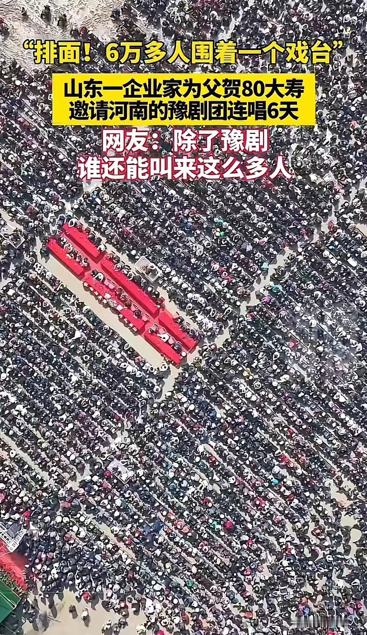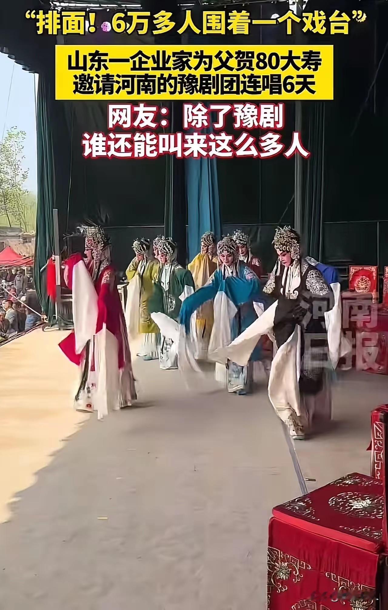 山东梁山,有个大老板掏了50万,请河南豫剧团给老爹80大寿助兴,结果场面彻底“失控”!网友:这50万花的太值了! 谁能想到,一场原本只为尽孝的寿宴,竟硬生生变成了轰动十里八乡的盛事,现场的火爆程度,完全超出了所有人的预料! 这位老板是土生土长的梁山人,在外打拼多年功成名就,心里始终记挂着操劳一生的老父亲。得知老爹 80 大寿最大的心愿就是听一场地道的豫剧,他二话不说砸下 50 万,专程请来专业的河南豫剧团,在村里搭起大戏台,打算连唱好几天,让父亲过足戏瘾,也让乡亲们沾沾喜气。 本以为只是村里小范围的热闹,可消息一传开,彻底炸了锅!周边乡镇、甚至邻县的戏迷们纷纷赶来,天不亮就扛着小马扎、带着干粮往村里赶。原本准备的几千个座位瞬间被坐满,晚来的人挤在广场四周、田埂边上,里三层外三层围得水泄不通,粗略一算,足足来了好几万人,现场人头攒动、人声鼎沸,安保人员忙前忙后,场面完全 “失控”! 锣鼓一响,豫剧开唱,经典选段一登场,台下瞬间沸腾。老人们听得热泪盈眶,频频拍手叫好;年轻人陪着长辈,沉浸式感受传统戏曲的魅力;就连小孩子都安安静静,盯着戏台看得入迷。老寿星坐在前排,看着热闹的人群,听着心爱的戏曲,脸上的笑容就没停过,满眼都是幸福与满足。 如今很多人祝寿,动辄去高档酒店摆豪宴、讲排场,看似体面,却少了几分烟火气与真心。而这位老板,没有铺张浪费,没有炫富攀比,而是精准戳中父亲的喜好,用老人最爱的方式尽孝,还把这份快乐分享给了全村乡亲。 50 万,买不来岁月,却买来了父亲满心的欢喜,买来了全乡邻里的欢声笑语,更诠释了什么是真正的孝顺。这场没有奢华排场的寿宴,没有山珍海味,却藏着最纯粹的温情,比任何昂贵的礼物都更有意义。 网友们纷纷留言赞叹:这才是寿宴该有的样子,这 50 万,花得值!比起铺张浪费的炫富,这种走心的孝顺,才最让人动容! 你见过这么热闹的乡村寿宴吗?你觉得最好的尽孝方式是什么?快来评论区聊聊!豫剧音效海报 豫剧名家演出