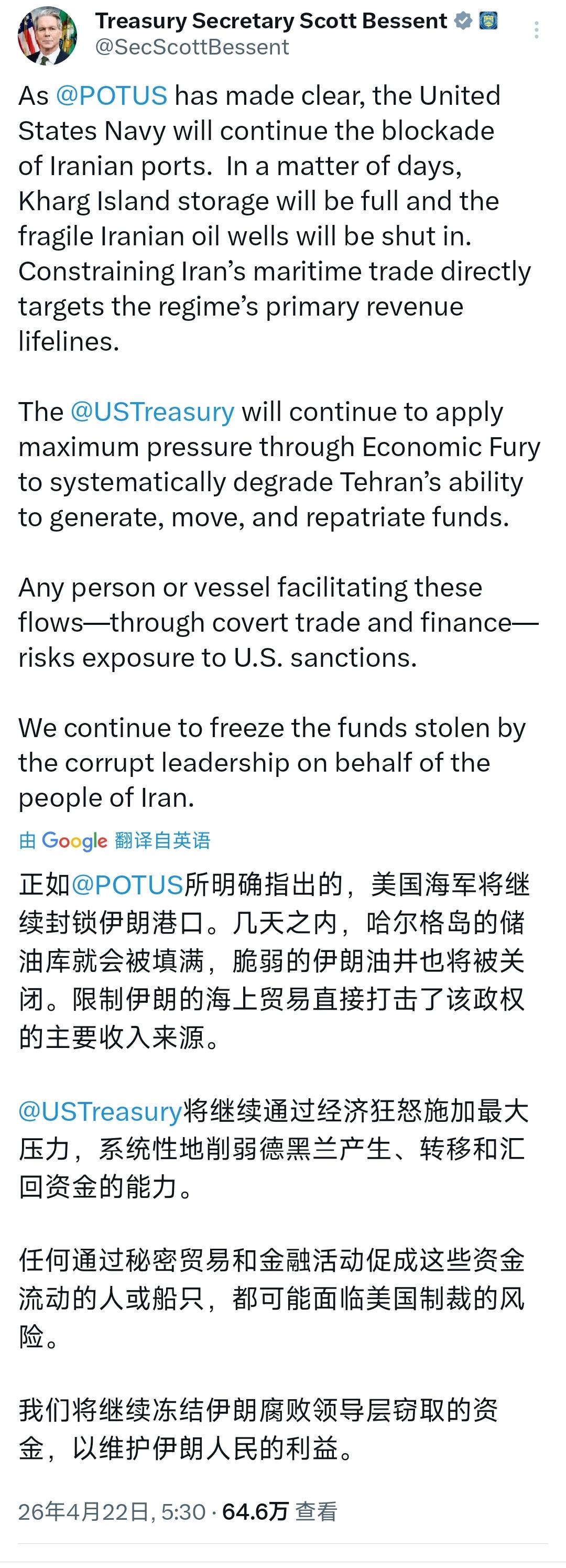 美国财长贝森特今天(北京时间4月22是)写道:“正如特朗普总统所明确指出的,美国海军将继续封锁伊朗港口。几天之内,哈尔格岛的储油库就会被填满,脆弱的伊朗油井也将被关闭。限制伊朗的海上贸易直接打击了该政权的主要收入来源。 美国财政部将继续通过经济狂怒施加最大压力,系统性地削弱德黑兰产生,转移和汇回资金的能力。 任何通过秘密贸易和金融活动促成这些资金流动的人或船只,都可能面临美国制裁的风险。我们将继续冻结伊朗腐败领导层窃取的资金,以维护伊朗人民的利益。” [机智]评几句:美国算准了油井关停对伊朗是致命一击。一旦停转,财政瞬间断供,连基本运转都难以为继。更致命的是,油井关停后重启极难。长期停产会让油井堵塞、设备老化,不仅要砸巨资修设备、补人力,还可能让部分油田彻底报废,伊朗原油产能想恢复到战前水平,没个一年半载根本没戏,这种损失是伤筋动骨的。可美国想靠封锁达成这个目的,远没贝森特说的那么简单,伊朗也有后手。 眼下伊朗有两大突围路径,让美国的封锁没那么容易奏效。一是海上“暗度陈仓”,伊朗的“影子船队”超420艘,靠关闭AIS、换船旗、公海过驳等手段,能一定程度绕开美军的监控偷偷运油,这是伊朗维持出口的底牌之一。二是陆路“另辟蹊径”,通过巴基斯坦、里海等通道转运石油,虽然成本高、运量有限,但也能解目前的燃眉之急,不至于让伊朗彻底断供。而且伊朗还提前储备了上亿桶原油,浮式储油设施也能暂时缓解哈尔克岛的库容压力,这些都为它争取了一些缓冲时间。 美国的封锁看似强硬,实则把自己也拖进了泥潭。长期封锁会让全球油价飙升,美国国内通胀压力会更重。另一方面,如果伊朗也进一步收紧霍尔木兹海峡管控,全球能源供应链会跟着遭殃,最后可能是两败俱伤。