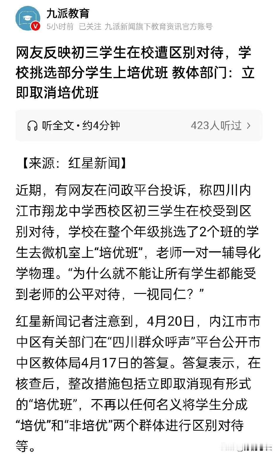 这是“红眼病”犯了?还是教育公平? 家长举报学校对初三部分优秀学生进行培优教学,认为这违反了阳光分班的原则,属于区别对待,应该让所有学生都有同样的培优机会。 现在的家长是真有尿-性,只要是我们得不到的东西,你也别想得到,我不想好,你们谁也别想好。 这是所谓的公平?还是人性的自私?非得绑在一口锅里吃,让胖子饿死,让瘦子撑死。 这真的一点意义都没有,因材施教才是教育的核心原则,不同的孩子,接受、领悟能力都不一样,对应的家庭环境、父母教育也不一样。 同一个老师,不同的班级,采用不同的教学体系,不同的教学进度,这才是最科学的,让胖子吃饱了,让瘦子也不至于消化不了。 所谓的阳光分班,个人理解为:只要选拔过程公开透明,彻底排除暗箱操作,每个孩子都有参加选拔的权利,凭孩子的能力去参加选拔就没有问题,让有限的优质资源最大限度发挥作用。 对此,条友们怎么看?