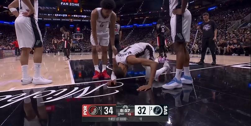 🙏文班亚马面部平拍地面重重摔倒,随后独自跑回更衣室…NBA季后赛马刺vs开拓者