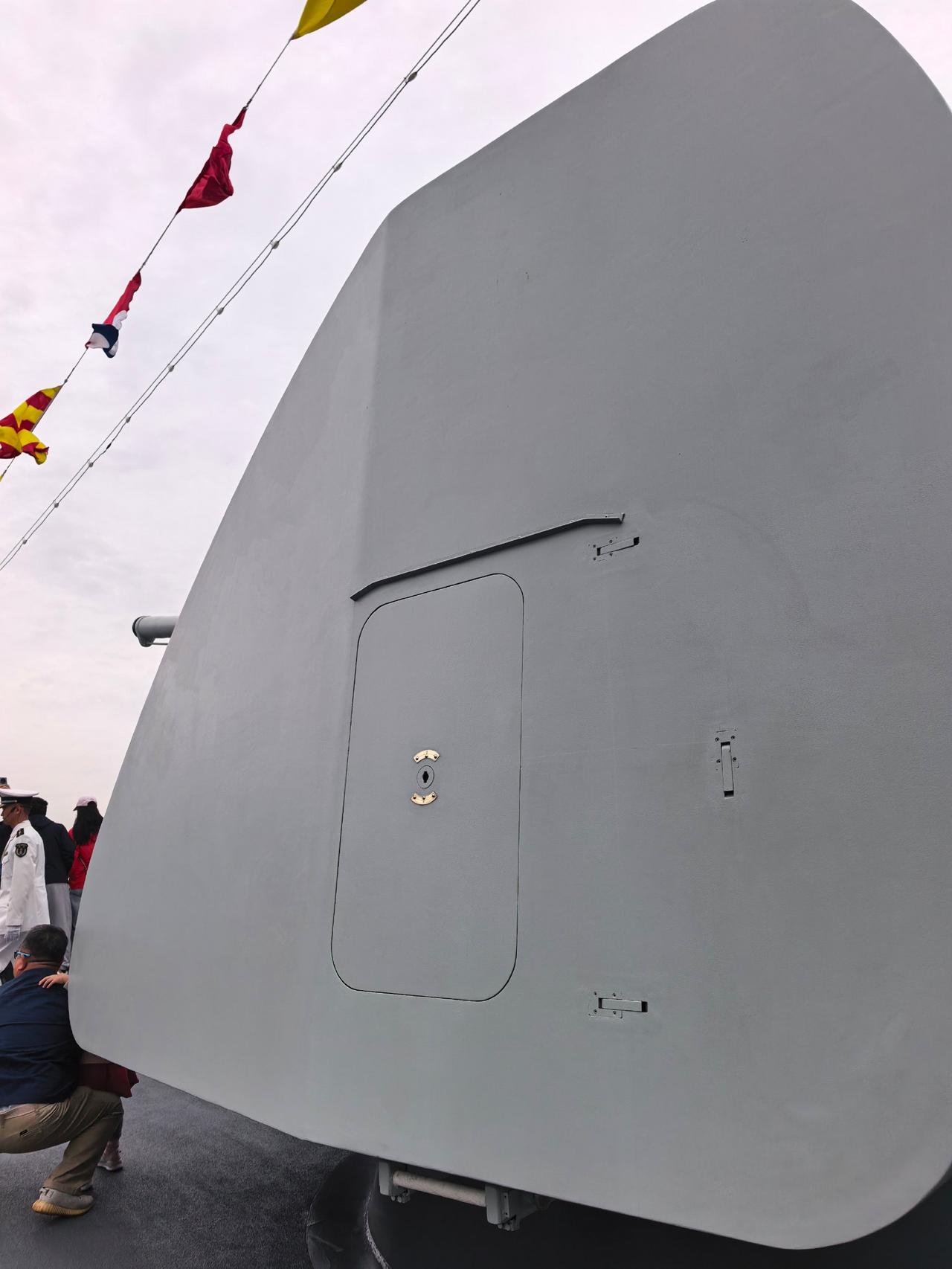 海军最新批次054A参加了近年的海军开放日活动,这时本批次换装的最新款单管100毫米舰炮,也被叫做馒头炮。央视报道中提到,该门火炮可以每分钟发射“百发以上”炮弹,看来火炮的自动机等有了很大改进,原型每分钟指标是90发。但是这个炮塔外壳太丑了,尤其是侧面,就不能搞点内倾斜切面吗,这种垂直的立面,就是妥妥的角反射器了。既不美观,也影响隐身效果。