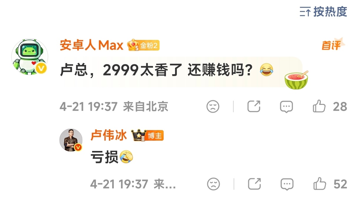 群众眼睛是雪亮的,都知道划算,卢总还亲自确认了 2999这个价格是亏损着卖的……所以能直接刷新记录,我觉得很正常,也应该。