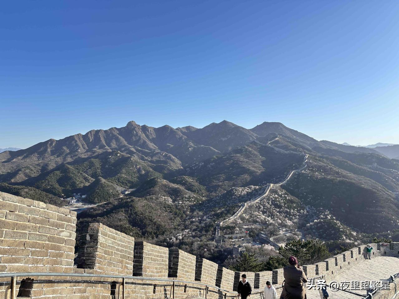 不得不说,亲眼见到长城真的被震撼到了!蓝天特别通透,山景层层叠叠,长城像巨龙一样盘踞在山上,望不到头。 爬长城真的是个体力活,台阶忽高忽低,走一段就得歇一下。沿途能看到很多历史痕迹,城墙斑驳又厚实,站在上面吹吹风,那种壮阔感立马就上来了。 山花都开了,粉粉白白的,和灰砖城墙特别搭,随手一拍都是大片。路上遇到很多游客,大家互相加油打气,还挺有意思。 虽然腿都走酸了,但看到这一幕真的觉得超值得,太解压了! 长城旅游照 长城登山