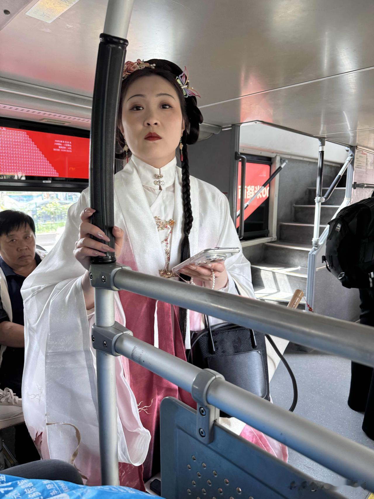 在北京穿汉服、古装的很多。 看到穿古装的多是在公园、大街上。 今天看到一个穿古装的美女是在公交车上。