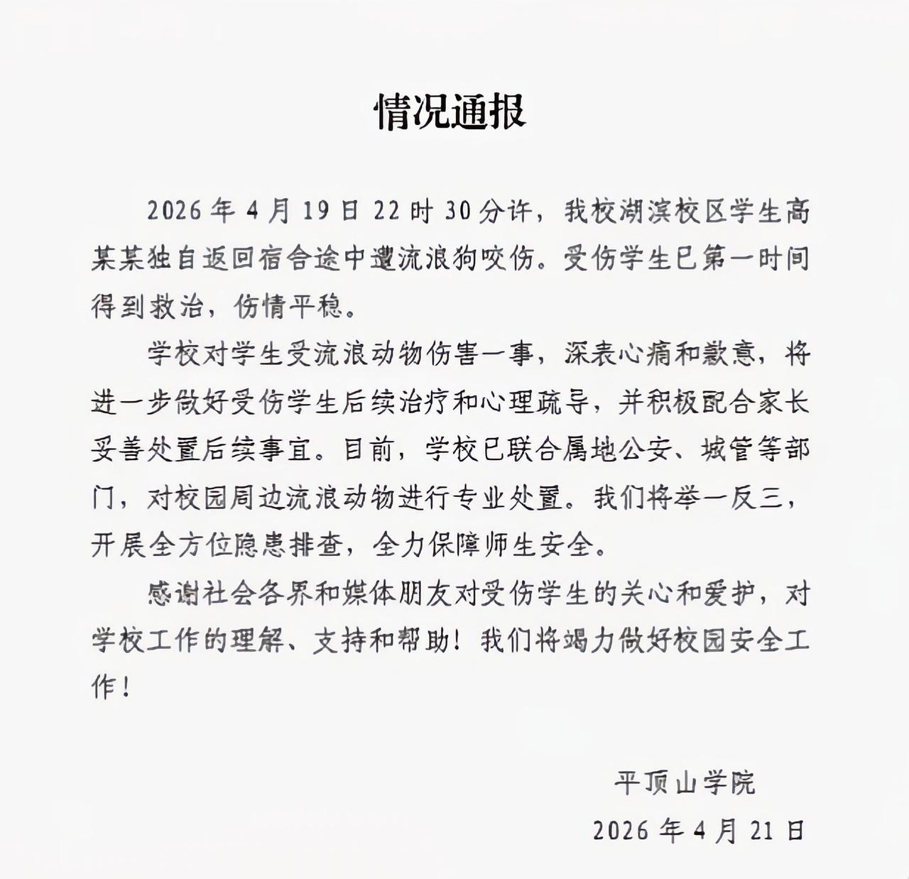 两年前辞退了捕抓流浪猫的2名保安,两年后女生在校内被狗围咬20多处伤口,“回旋镖”终是打回了自己身上。当年漫天的指责、施压的人,是不是该站出来给被咬的女生道一声歉了? 2026年4月19日晚,平顶山学院内,文学院大三的高同学没有和平常那样骑电动车,因为当天的风比较大。10点半左右,高同学在图书馆学完习,顶着夜风急匆匆的朝宿舍走去。 然而,就在她走到校内智达书院与科技楼的交叉路口时,忽然从黑暗中冲出一只黑狗。黑狗迅速朝她扑去,并对其进行撕咬,高同学一时间惊慌失措。 就在她被黑狗撕咬并打算跑开时,周围接二连三的又窜出多只黄狗,并一起扑向高同学。 被一群狗围着咬,高同学惊恐的大声喊着求救,但是她越喊狗咬得越厉害。万分危急时刻,一位骑电动车男生带着一位女生路过。 看到情况不对,男生骑着电动车猛地向狗群撞去,经过几次连续地冲撞后,狗群终于跑开了! 此时,高同学因害怕加上被咬伤,几乎要瘫软在地上,女生快步向前扶住了她,并将她搀扶回宿舍楼。回到宿舍楼的高同学,被刚才的经历吓得一直哭。 当天晚上,班干部和室友知道她被狗咬伤后,先是帮她用肥皂水冲洗了伤口15分钟,然后陪着她去打了狂犬病疫苗和免疫球蛋白。次日上午,辅导员再次带她打了破伤风针。 后经检查,高同学身上,总共被狗咬伤20多处! 高同学在校园内被狗咬伤后,另有同学表示自己从图书馆往回走的时候,也遇到过一群狗从草丛里冲出来对着她叫,当时她迅速跑开了。 “没想到居然真的咬人了!”那名同学回想起来,仍然有些害怕的说道。 另外,那名同学还表示,高同学被咬后的第二天,也就是4月20日晚上。她在去图书馆的时候,看到学校3号楼下坡和图书馆交叉的那个路口,有学校的保安人员拿着长长的棍子在那儿,并且有人说着“狗笼子”之类的话。她猜测,学校可能正在组织保安抓狗。 说到该校现在组织保安抓狗,让人忍不住想起两年前,因捕抓校内流浪猫被学校辞退的两名保安。 同样是在4月,不过是两年前的2024年。平顶山学院辞退了两名该校的保安,原因是捕抓校内的流浪猫。 2024年4月,该校有学生向辅导员反映,被学校的流浪猫抓伤,随后学校的两名保安开始捕抓校内流浪猫,过程中捕杀了一只流浪猫。 事后,两名保安捕抓校内流浪猫的过程,被人发布到网上并引起了争论。 网上的一些爱狗猫人士及部分该校学生,认为两名保安捕杀流浪猫的过程及行为过于残忍,认为他们没有爱心,是在“虐”猫。一时间,类似的评论铺天盖地! 后来,可能出于外部评论的压力,学校在该事的处理结果上,表示“属于相关人员个人行为,与校方无关”,并直接开除了这两名保安。另外,还公开承诺不再捕杀、伤害校内的流浪动物,改用更温和的方式管控。 可能正是2024年的那个承诺,才导致了两年后校内的流浪动物增多,出现了高同学被咬20多处伤口的事情。 高同学被咬后,学校很快发布了通报,除了深表歉意,承诺做好高同学的后续治疗和心理疏导,配合家长处置后续事宜外,还表示已联合当地多部门,对校内及周边流浪动物进行专业捕捉与处置。 如此而言,当年那把被学校扔出去的“回旋镖”,终是在两年后又落回了自己身上! 学校已经对高同学“深表歉意”了,当年那些指责保安、造压力的人,是不是也应该站出来表示一下了呢?