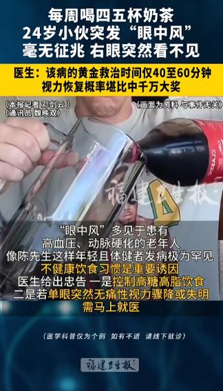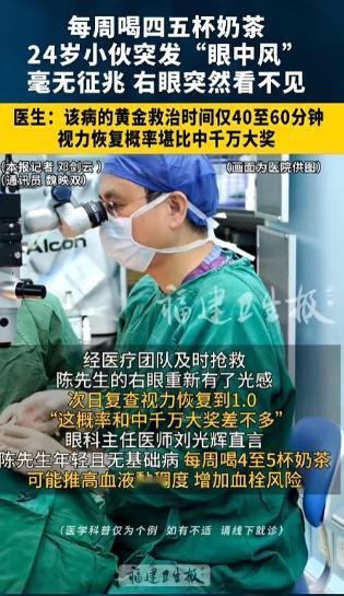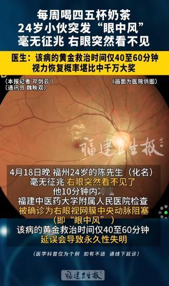“中大奖了!”4月18日晚,福建福州,一年轻小伙突然间发现,自己右眼看不见了。他一路狂奔,不到10分钟就冲进了医院。医生检查后是眼中风,黄金救治时间不超1小时。没想到男子第二天视力就恢复了!医生:运气堪比中千万大奖! 福建福州一则急症案例近期引发全网关注,打破了很多人“奶茶只致胖”的固有认知。 一名24岁小伙无任何基础疾病,日常无不良嗜好,仅因长期频繁饮用奶茶,突发罕见眼部急症,短暂失明后虽幸运获救,但其背后的健康隐患,值得每一个爱喝奶茶的人警惕。 24岁的小陈在福州一家互联网公司工作,平时注重保养,每年定期体检,血压、血糖、血脂均正常,不抽烟、不熬夜,唯一的爱好就是喝奶茶。 他对奶茶的饮用近乎依赖,每周固定喝四五杯,且必选全糖、加奶盖的高脂款,有时加班晚了还会额外加购,从未想过这种日常饮品会有致盲风险。 4月18日深夜11点15分,小陈洗漱后准备休息,右眼突然眼前一黑,随后视野彻底陷入黑暗,无论揉搓眼部、转动眼球,都无法感知光线,连手指晃动都无反应。 慌乱中,他来不及通知家人,抓起手机就往最近的医院狂奔。 小陈所住小区距福建中医药大学附属人民医院仅1公里,他全程狂奔、未浪费一分一秒,从发现异常到冲进急诊眼科仅用时9分钟,这短短9分钟,成为他保住视力的关键,也印证了急症救治“分秒必争”的重要性。 急诊眼科医生立即启动诊疗流程,为小陈做视力筛查、眼底荧光血管造影等检查,很快确诊为“眼中风”——视网膜中央动脉阻塞。 这种眼科急症发病率低、凶险度高,很多人甚至从未听说过。 接诊的眼科主任医师介绍,“眼中风”发病机制与脑中风相似,均为血管被栓子堵塞导致组织缺血坏死,但它的黄金救治时间仅40至60分钟,被称为“眼科的生死时速”,超时会导致视网膜细胞不可逆坏死,最终永久失明。 结合小陈长期喝奶茶的习惯,医生明确这是发病核心诱因。 市面上多数奶茶每杯含蔗糖30-50克,远超成人每日推荐量,加上奶精、植脂末等成分,长期饮用会升高血液粘稠度,形成脂肪栓子,一旦堵塞视网膜中央动脉,就会引发突发失明。 “眼中风”原本是60岁以上老人的“专属疾病”,多发生在有高血压、动脉硬化等基础病的人群中。 但近5年来,20-35岁年轻人患病案例逐年递增,80%以上都有长期喝高糖高脂饮品、吃油炸食品的习惯。 很多年轻人对“眼中风”认知为零,出现视力骤降时误以为是休息不足,拖延就医。 医生提醒,其典型症状是无痛性、突发性视力骤降或失明,无任何前兆,出现症状需立即就医,切勿拖延。 确诊后,医院立即为小陈实施救治:舌下含服硝酸甘油扩张血管,同时进行眼球按摩促进栓子移动,同步给予高浓度吸氧,为视网膜细胞争取存活时间,全程紧凑有序。 5分钟后,小陈右眼恢复微弱光感,瞳孔缓慢回缩,救治初见成效。 当晚他在医院留观,因担心视力无法恢复,整夜未眠,频繁观察视力变化。 4月19日清晨7时20分复查,小陈右眼瞳孔恢复正常,裸眼视力达1.0,与发病前一致;眼底检查显示,视网膜动脉血流恢复正常,栓子已移至血管末梢,不再影响供血。 主治医生表示,小陈的恢复概率不足万分之一,堪比中千万大奖。 我国每年因“眼中风”失明超10万人,90%以上因送医不及时致视力严重受损。 医生同时强调,小陈眼底可能残留栓子,后续可能出现视野暗点,需每月复查,持续观察6个月。 类似案例并不少见:杭州22岁女生每天喝2杯奶茶,突发左眼视力骤降确诊“眼中风”,因延误2小时就医,左眼视力仅恢复至0.3。 小陈的案例引发网友热议,相关话题冲上热搜,不少爱喝奶茶的网友表示被吓到,决心戒掉奶茶。 这场险些酿成的遗憾,给年轻人敲响警钟:奶茶虽美味,不可长期大量饮用,否则会引发血管堵塞等严重急症。 年轻人也需了解眼科急症知识,出现视力异常立即就医,切勿抱有侥幸心理,眼睛健康容不得半点拖延。 如果各位看官老爷们已经选择阅读了此文,麻烦您点一下关注,既方便您进行讨论和分享,又能带来不一样的参与感,感谢各位看官老爷们的支持!