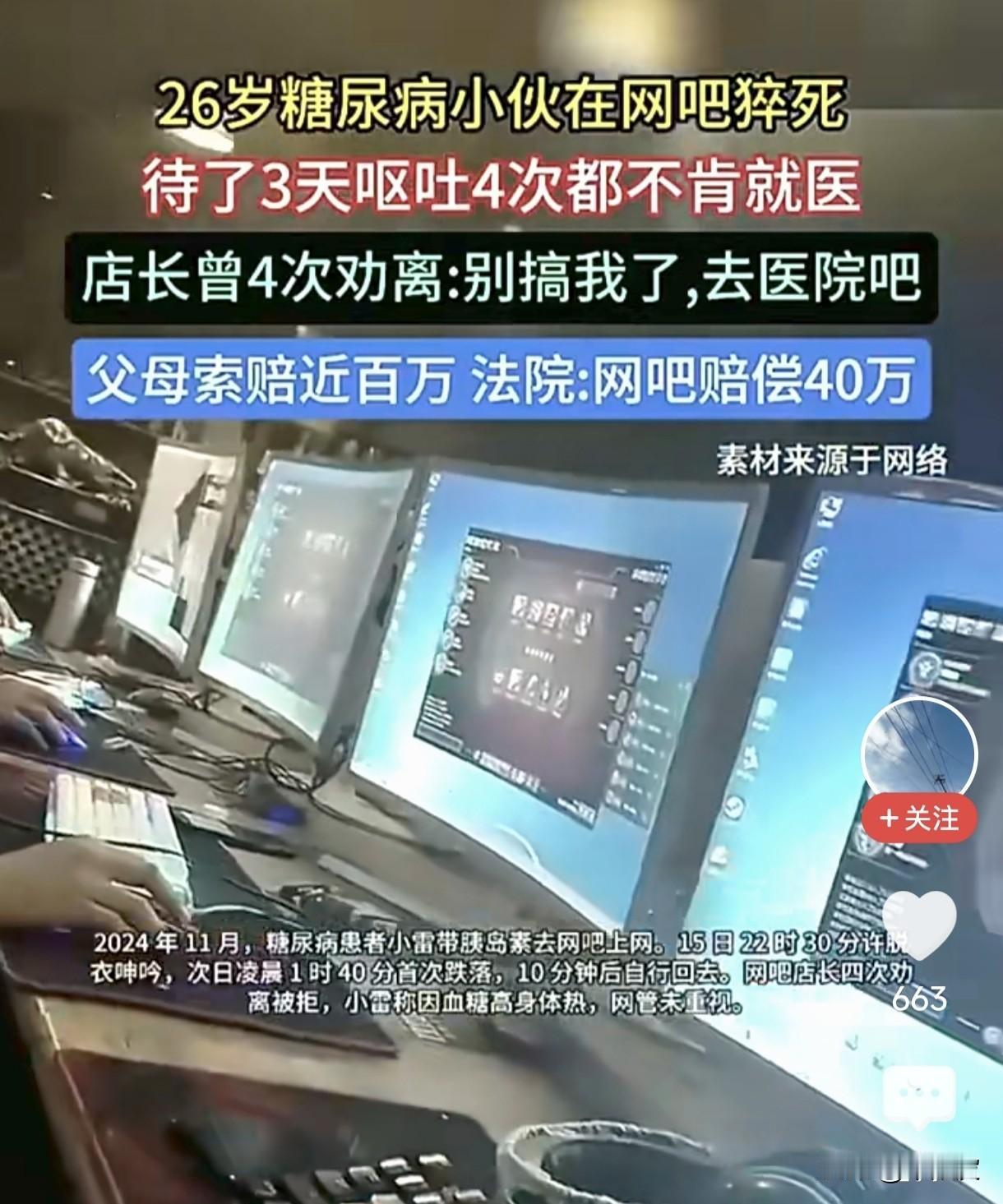 26岁糖尿病小伙网吧猝死赔40万:自己不要命,凭什么让别人兜底? 看完这个案子,我心里又堵又懵,满脑子都是问号:这到底是谁的错?成年人的责任,到底该谁来负? 一个26岁的大小伙子,明知道自己有糖尿病,随身带着胰岛素,却一头扎进网吧,一待就是整整3天。 这3天里,他的身体早就发出了死亡预警:先后呕吐了4次,甚至当众摔倒在地。网吧店长看在眼里,急在心里,前前后后4次劝他离开,甚至近乎哀求地说:“别搞我了,去医院吧!” 可他呢?执意不走,只说自己就是血糖高、身体热,没什么大事,依旧守在电脑前。直到最后,生命永远停在了那个网吧里。 人没了,白发人送黑发人,父母的悲痛我们都能理解。可转头,老两口就把网吧告上了法庭,张口就要近百万的赔偿。而最终的判决结果,更是让我大跌眼镜:网吧被判赔偿40万。 我真的想不通,这到底是凭什么? 他是一个26岁的成年人,具备完全民事行为能力,自己的身体状况自己最清楚。明知道有严重的基础病,还要连续3天熬夜泡网吧,透支自己的生命;老板4次苦口婆心劝他去医院,他自己执意不听,放弃了最后活命的机会。 自己亲手把命作没了,到头来,却要开门做生意的网吧来为他的任性买单? 有人说,网吧有安全保障义务。可我想问,到底什么才叫尽到了义务? 难道要老板把他五花大绑送去医院?还是要老板24小时盯着他,给他测血糖、打胰岛素、管着他的吃喝拉撒? 他不是三岁小孩,网吧也不是医院,更不是他的监护人。老板已经做到了能做的一切,劝了又劝,仁至义尽,还要他怎么样? 26岁,多好的年纪啊。就算有糖尿病,好好控制、好好生活,人生照样有无限可能。可他偏偏选择了最放纵、最不爱惜自己的活法。 连续3天3夜的熬夜,就算是铁打的健康人都扛不住,更何况是本就有基础病的身体?他自己放弃了自己,最后却要别人为他的选择兜底,这合理吗? 我始终觉得,可怜,从来都不能成为不分是非对错的理由。 父母失去孩子确实可怜,但这份悲剧的根源,从来都不是网吧没拦住,而是孩子自己对生命的漠视。索赔近百万,判赔40万,这笔钱买不回孩子的命,更改变不了悲剧的根源,只是找了一个人为孩子的任性背锅而已。 更让我寒心的是,现在这种事越来越多了。 自己不守规矩在景区出事,告景区;自己喝酒喝死在饭店,告饭店;自己骑电动车闯红灯被撞,怪机动车;如今自己熬夜泡网吧猝死,也要告网吧。好像只要出了事,就一定能找到一个“冤大头”来买单,从来不肯先反思自己。 可我们总要明白,成年人的世界,自己才是生命和健康的第一责任人。 你的命,你自己都不珍惜,没人能替你负责;你的选择,你自己做的,就要自己承担后果,而不是逼着别人来给你兜底。 最可惜的,还是这个26岁的年轻人。人生没有重来的机会,生命只有一次,你亲手把它挥霍了,就再也找不回来了。 最后想问大家一句,对于这个判决,你怎么看?你觉得网吧该赔这40万吗?评论区聊聊你的看法。