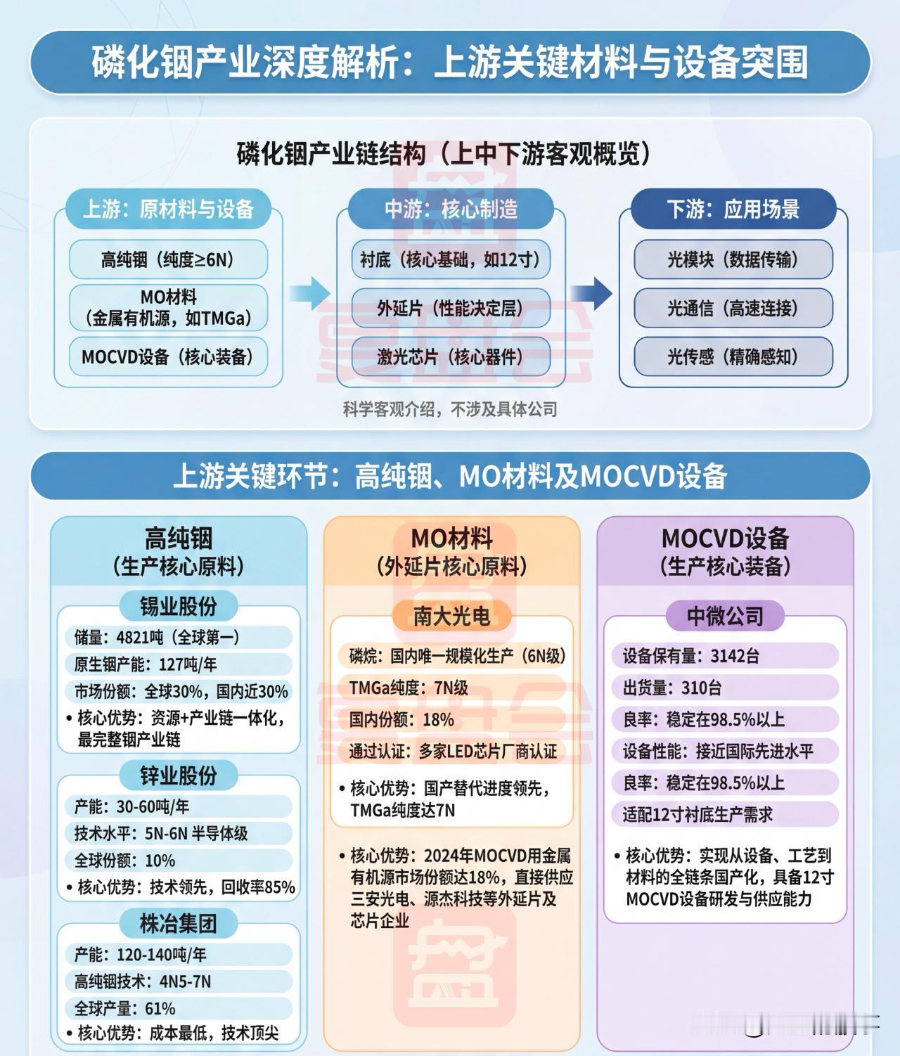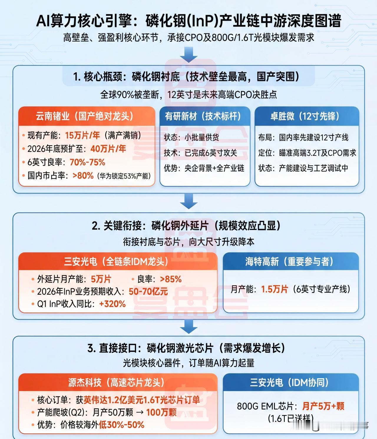 磷化铟爆火!光芯片终极材料,全产业链龙头一网打尽🔥 AI算力狂飙,800G/1.6T光模块全面迭代,磷化铟作为下一代高速光芯片的核心底层材料,国产替代大背景下,全产业链卡位厂商迎来史诗级机遇,完整名单一次性收好👇 📌 细分赛道+核心标的 ✅ 高纯铟资源 锡业股份、豫光金铅、金圆股份、欧莱新材 ✅ 电子级红磷、MO源上游 兴发集团、南大光电 ✅ 磷化铟晶片/衬底 云南锗业、博杰股份、海特高新 ✅ 外延片&芯片制造 三安光电、金时科技 ✅ 磷化铟激光芯片 纵慧芯光(未上市)、东阳光、华西股份、比亚迪、长光华芯、兆驰股份 ✅ 配套布局厂商 铭普光磁、华工科技、江丰电子、凯德石英 ⚠️风险提示:本文仅为市场复盘分析,不构成投资建议,市场有风险,投资需谨慎。 如何看待当下的股市?今日A股 股市分析