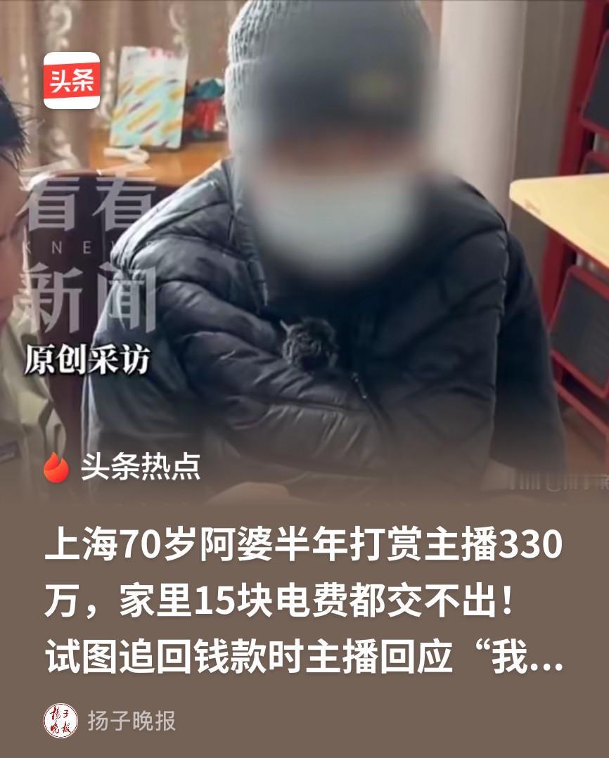 “害人不浅!”上海,一男子援边回家,发现70多岁的母亲,连十几块钱的电费,都交不起了。男子懵了,随后一查,竟然发现节俭了一辈子的母亲,却在半年前接触网络直播后,像着了魔一样,短短半年的时间里,打赏给2名30多岁的男主播,高达330余万元。 这位男子姓王,是上海支援西部边陲的工作人员。母子俩相依为命,他常年在外打拼,放心把所有工资奖金都交给母亲保管。 毕竟在他印象里,母亲江阿婆这辈子节俭到了骨子里。菜场买棵青菜要货比三家,几毛钱的差价都要讨价还价,家里的旧物件能修就修,从来舍不得扔。 可这次回家,迎接他的不是热饭热菜,而是催缴电费的通知单。十几块钱的费用,母亲竟然拿不出来,这让王先生彻底懵了。 他赶紧去查家里的银行流水和手机充值记录,结果看得他头皮发麻。从去年5月到现在,短短半年时间,母亲累计打赏出去336万多,平均每个月花掉50多万。 这些钱不仅花光了母亲每月5000多的养老金,还掏空了他多年攒下的积蓄。而这笔巨款,全砸给了两个素未谋面的男主播。 一个是微信视频号的跳舞主播,拿到了280多万打赏。另一个是抖音的唱歌主播,分走了50多万。两个主播都是30岁左右的年纪,靠着屏幕里的表演,就卷走了一个普通家庭的全部家底。 王先生实在想不通,一辈子省吃俭用的母亲,怎么会变得如此疯狂。直到他和母亲深谈,才摸清了其中的门道。 江阿婆是半年前刷到跳舞主播的视频,觉得对方阳光帅气,舞跳得好还谦虚,一下子就有了好感。后来进了直播间,就彻底被里面的氛围套牢了。 主播们最常玩的就是PK对战,两个主播连麦对抗,5分钟内粉丝刷的礼物越多,主播就赢。输的一方要被“处罚”,比如脸上画叉。 江阿婆就吃这套,她觉得自己是在“守护”喜欢的主播。只要主播一喊“家人们帮忙冲一下”,或者管理员在旁边煽风点火“团结一心打倒他们”,她就控制不住自己。 3000块一个的“桃花岛”礼物,她一次能刷三四个。就为了不让自己支持的主播输,不让他被画叉,心里能舒服点。 到了后来,江阿婆已经完全麻木了。用她自己的话说,打赏的时候脑子一片空白,就像着了魔。 最让王先生揪心的是,母亲根本没意识到问题的严重性。就算家里已经一穷二白,她还惦记着下个月的养老金,想继续给主播刷礼物。 无奈之下,王先生带母亲去了精神卫生中心。初步诊断结果是抑郁发作加焦虑状态,这或许能解释她一部分反常的行为。 但这背后,更多的是直播间精心设计的情感陷阱。心理专家说得很透彻,老年人群体沉迷打赏,本质是情感需求被错位满足了。 江阿婆常年一个人生活,儿子远在边疆,她的生活里缺陪伴、缺关注。而直播间里的男主播,嘴甜得发齁,一口一个“阿姨”“姐姐”地叫着。 刷个小礼物就被点名感谢,刷个大礼物就能被捧成“守护大哥”,这种前所未有的存在感和价值感,让她彻底沦陷。 再加上PK机制带来的竞争感,打赏后立刻就能得到反馈的多巴胺刺激,一步步把她推向了失控的边缘。这哪里是看直播,分明是被人精准收割。 更可气的是,当江阿婆醒悟过来,想联系主播追回点钱时,对方只轻飘飘说了句“我们好好相处,细水长流”,之后就再也没回应过。 王先生没少找平台投诉,也报了警,但直到现在都没个结果。钱能不能追回来,还是个未知数。 从法律层面来说,这事确实难办。想追回打赏,首先得证明江阿婆打赏时是限制民事行为能力人,这需要司法鉴定和法院认定。 而且直播平台通常会分走一半左右的打赏金额,剩下的再由MCN机构和主播分配。真要追讨,得跟平台、MCN、主播三方扯皮。 律师也说了,只能希望平台能考虑到老人的实际困难,从利润里返还一部分。但这终究是“希望”,没有强制力。 这事看着是个例,其实暴露了直播行业的很多乱象。现在有些主播和MCN机构,根本不靠优质内容吸粉,专门盯着老年人、未成年人这些群体下套。 他们精心包装人设,要么是阳光帅气的“大男孩”,要么是身世可怜的“追梦人”。再配上剧本化的直播、煽动性的话术,把直播间变成“财富收割场”。 更让人无语的是平台的监管缺位。330多万的打赏,半年内密集支出,平台既没有设置打赏上限,也没有给出任何风险提示。 要知道,中央网信办早就开展过整治网络直播打赏乱象的专项行动,明确要打击虚假人设诱骗打赏、刺激用户非理性打赏等行为。可规定到了执行层面,还是有漏洞。 其实这事也给所有家庭提了个醒。家里有独居老人的,别光想着给钱,更要多给陪伴。老人之所以会被直播间的甜言蜜语迷惑,说到底还是孤独太久了。 平时多跟老人聊聊天,教教他们识别网络套路,帮着设置一下支付限额。这些小事,远比事后追讨损失要管用得多。 现在王先生还在跟平台交涉,母亲的情绪也慢慢稳定下来。但那330多万,大概率是很难全额追回了。