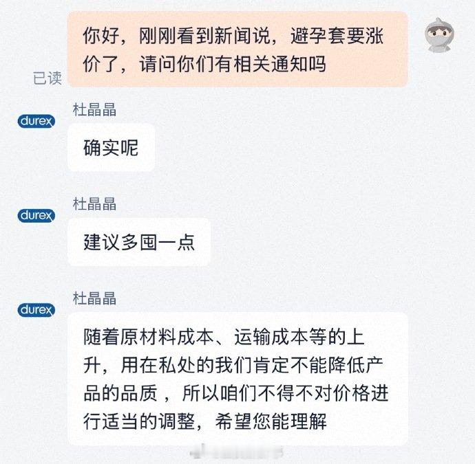 4月22日,就此事询问杰士邦、杜蕾斯、第6感等知名避孕套品牌,得到回复目前已经对价格进行调整。其中杜蕾斯表示,随着原材料成本、运输成本等的原因上升,不得不对价格进行适当调整。