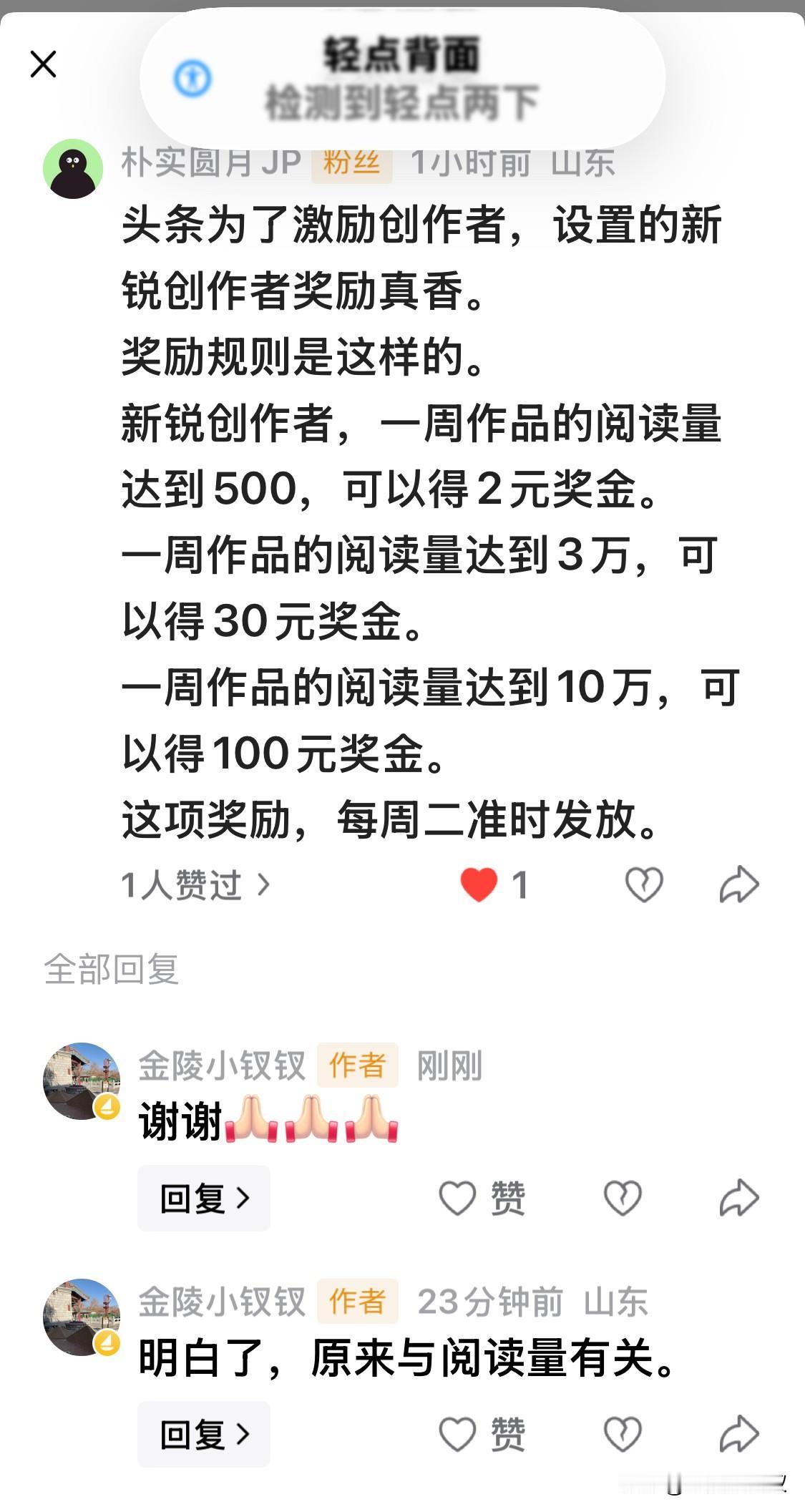 我真是个大老粗啊!只知道低头拉车,不知道抬头看路。昨天晚上发了篇天降大饼砸着我了,是说自己不知道头条新锐创作者的奖励机制和标准,以前都是30元,昨天收到100元。 今天就看到热心网友 发的奖励标准,我才知道原来是和阅读量有关,我平时每周得30元,是因为阅读量低于10万,若高于10万阅读量,奖金自然就是每周100元了,看看我有多粗心吧,不知道比赛标准,想要得到好的结果只能是听天由命了,但如果知道了评判标准,我是不是可以利用政策研究一下策略呢? 其实这个阅读量要想突破也是可以的,那就是多写,难怪人家大咖能每周得到100元,人家除了粉丝多外,最重要的是写的多,一天写无数条微头条,肯定就能有阅读量了,那我是不是可以多写呢? 多写恐怕不行,不能为了写而写,更不能为了阅读量写那些乱七八糟的东西,那我是不是可以写点短小精悍的小文呢? 这个可以有,我似乎是找到了突破口,至于结果如何,还是那句话:听天由命。不对!应该是看网友愿意看不看了,评判权在网友眼中。 感谢@朴实圆月JP的留言,让我知道网友的眼睛是雪亮的,奖金是网友看出来的,麻烦诸位多看我一眼吧,哈哈😄! 这一天天的!