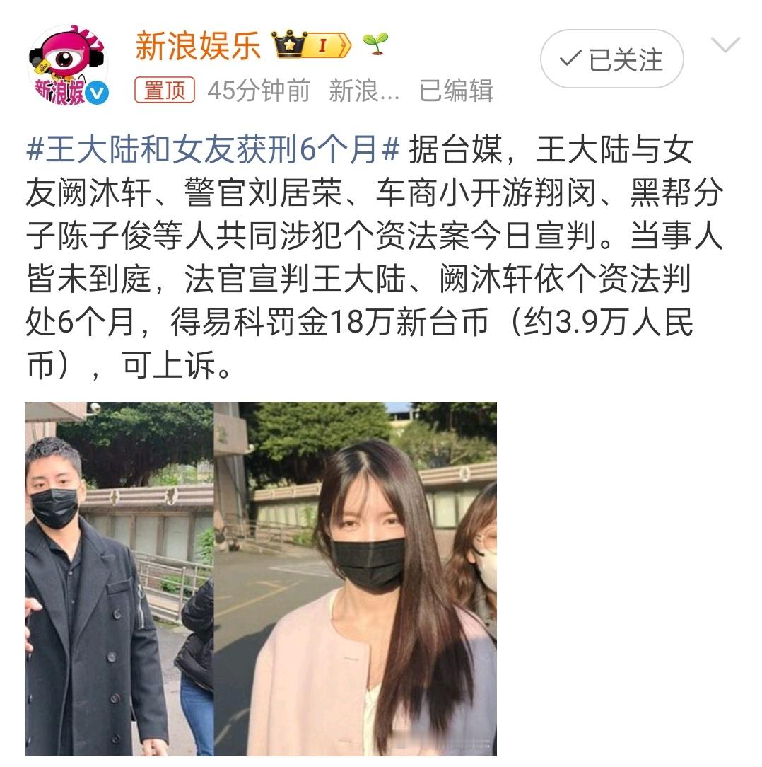 王大陆和女友获刑6个月到现在才判啊