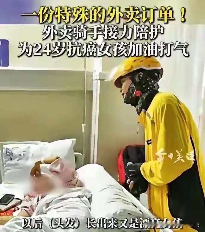 “坐在病床前陪我2小时!”广东佛山一名24岁患癌女孩,在医院里下了个特别的跑腿单,备注只有一句话:坐在病床旁陪我两个小时。没人想到这张小小的订单,竟点燃了一座城的温暖,全城骑手接力守护,无数网友看哭了。 这位让人心疼的女孩,今年才24岁,正是人生最美好的年纪,本该和同龄人一样,享受生活、追逐梦想,却被突如其来的癌症彻底打乱了人生。 年纪轻轻的她,确诊了恶性肿瘤,长期在医院接受化疗,病痛的折磨、漫长的治疗,让原本活泼的女孩变得沉默寡言。 住院的日子里,身边没有时刻陪伴的家人,父母为了凑齐高昂的治疗费,不得不外出打工赚钱,身边的亲人也无法24小时守在病床前,空荡荡的病房里,只有她一个人面对病痛和孤独,那种无助和孤单想想都让人心酸。 生病后的无数个日夜,女孩独自躺在病床上,看着窗外人来人往,心里的孤独越来越浓。 她不想打扰忙碌的家人,也不想麻烦身边的朋友,可实在太渴望有人能陪在身边说说话,哪怕只是安安静静地坐一会儿。 思来想去,她抱着试一试的心态,在外卖平台上下了一张特殊的跑腿订单,没有填写任何需要购买的物品,只在备注里认真写下:麻烦来个人坐在病床边陪我两个小时就好。 写下这个请求时,女孩心里也充满忐忑,她不知道会不会有人接单,毕竟骑手们都忙着跑单赚钱,谁愿意花2个小时,做一件没有任何报酬、又浪费时间的事呢?可让她万万没想到的是,订单刚发出不久,就有一位外卖骑手毫不犹豫地接了单。 这位骑手赶到医院病房,看到病床上虚弱又孤单的女孩,瞬间就明白了一切。 他没有丝毫犹豫,放下手中的东西,安安静静地坐在病床边,陪着女孩聊天、解闷,听女孩诉说心里的委屈和对未来的担忧,也耐心地安慰她鼓励她。 整整2个小时,他没有抱怨、没有不耐烦,全程温柔陪伴,用最朴素的方式温暖了女孩无助的心。 完成陪伴后,这位骑手心里久久不能平静,他把女孩的情况和这张特殊订单,悄悄发到了佛山本地的骑手交流群里,简单说了一句:“医院里有个24岁的患癌小姑娘,很孤单,想有人陪她坐一会儿,有空的兄弟姐妹们可以搭把手。” 就是这样一句简单的话,瞬间在骑手群里炸开了锅,也点燃了全城骑手的爱心。群里的骑手们看到消息后,纷纷主动报名,一场跨越全城的爱心接力,就此悄然开始。 这些平日里风里来雨里去的骑手,放下了手中的急单,挤出自己宝贵的休息时间,一波又一波地赶往医院。 有的骑手刚送完一单,顾不上休息和吃饭,直奔病房陪女孩,有的骑手特意提前结束跑单,就为了多陪女孩一会儿,还有的骑手,特意带上水果、牛奶、小零食,悄悄放在病床边,用自己的方式表达关心。 他们大多是普通人,生活并不富裕,每一分钱都是靠风吹日晒跑出来的,但面对这个素不相识的女孩,他们没有丝毫计较。 不善言辞的骑手,就默默坐在床边,帮女孩递水、整理衣物,能说会道的骑手,就给女孩讲自己跑单时遇到的趣事,逗她开心,帮她驱散病痛带来的阴霾,跑夜单的骑手,凌晨收工后,哪怕再疲惫,也会绕路去医院看一眼陪女孩说上几句话。 渐渐地,这场爱心接力不再局限于佛山本地骑手,越来越多的陌生人也加入进来。 有人特意赶到医院,给女孩加油打气,有人在线上为女孩祈福,送去祝福,还有人主动联系医院,想要为女孩提供帮助,整个佛山因为这张小小的订单,变得格外温暖。 这件事被分享到网上后,迅速刷屏全网,无数网友看得热泪盈眶。 大家纷纷留言:“破防了,这群骑手太善良了”“平凡的人做着最伟大的事,这就是城市的温度”“愿女孩早日康复,愿所有好心人一生平安”。 我们总说,生活不易,人心浮躁,可在这些平凡的外卖骑手身上,我们看到了最纯粹、最动人的善良。 他们每天为了生计奔波,却愿意停下匆忙的脚步,花时间去温暖一个陌生人,他们没有惊天动地的壮举,却用最简单的陪伴,诠释了人间大爱。 2小时的陪伴很短,可传递的温暖却很长。这张特殊的订单,不仅治愈了生病的女孩,也温暖了整个网络、整座城市,它让我们明白,世间最珍贵的从来不是金钱和利益,而是陌生人之间的善意,是困境中伸出的一双双手,是不离不弃的温暖陪伴。 如今,女孩依旧在积极接受治疗,而这场爱心接力还在继续,愿这个坚强的24岁女孩,能被世界温柔以待,早日战胜病魔,重拾健康人生。 也愿每一个为生活奔波的善良骑手,一路平安,收获属于自己的幸福,这座城市因他们而温暖,这份善意也永远值得我们铭记和传递。
