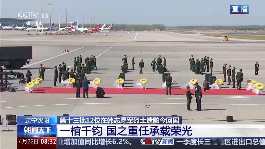 今天,12位志愿军烈士回家!海军这个首次,看得我破防了 刚刷到直播,眼泪没忍住。 2026年4月22日,第13批12位在韩志愿军烈士,终于回家了。运-20B“荣归50”专机、歼-20“红鹰”护航,沈阳机场“过水门”接风。 但最让我心头一震的是——人民海军首次以最高礼仪迎接。就在运-20进入我国领空、飞过旅顺港的那一刻,鄂尔多斯舰全舰悬挂满旗!满旗啊,那是海军舰艇的最高礼遇。 当年他们跨过鸭绿江,连像样的海空军都没有。今天,国产大飞机、隐身战机、挂满旗的战舰……都在说同一句话:祖国强大了,接您回家。 塔台那句“祖国从未忘记,人民从未忘记”,听得我浑身发麻。 去时少年身,归来英雄魂。山河无恙,这盛世如你们所愿。 转发,致敬!🕯️志愿军归家 运20接英烈 祭扫烈士遗骸