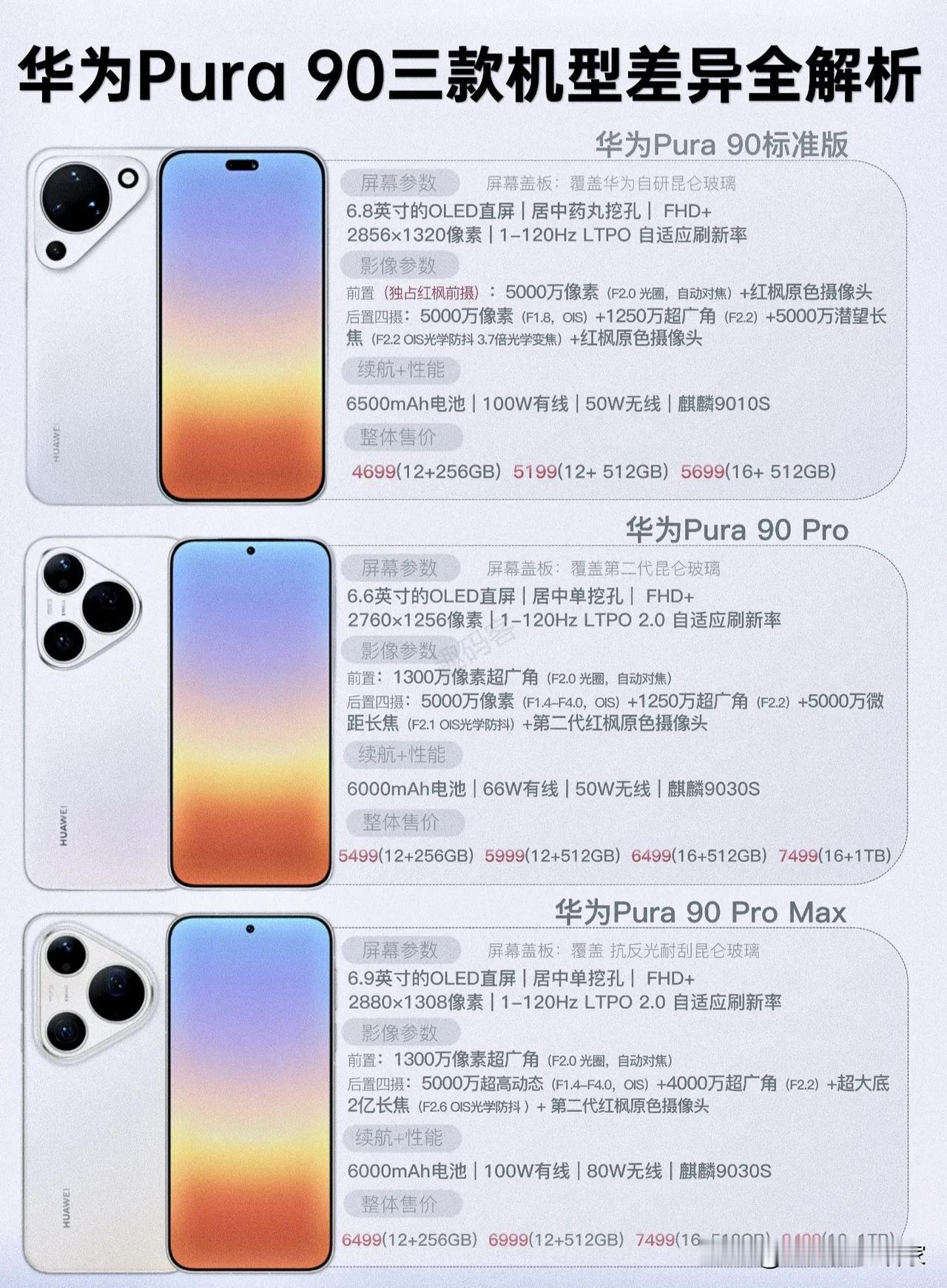 华为Pura 90三兄弟怎么选?别再只看摄像头,这几个细节才是关键📸 刷到华为Pura 90系列的参数对比,很多人第一反应是“Pro Max的镜头好强”,但看完这张图我才发现,这三款机型的差异,藏着华为精准拿捏不同用户的小心思。今天就扒一扒,标准版、Pro、Pro Max到底差在哪,谁才是你的最优解? 🔍 一眼看懂核心差异:别被“Max”的名头骗了 先划重点,这三款的核心差距,其实集中在三个地方:影像天花板、性能配置、续航快充,而不是大家以为的“Max就是全方位碾压”。 1. 标准版:性价比“水桶机”,普通人闭眼入 - 优势:独家红枫前摄+麒麟9010S+6500mAh超大电池,这配置在同价位里几乎没有对手。 - 细节:1-120Hz自适应直屏、100W有线+50W无线,续航和快充拉满,后置四摄也完全够用。 - 适合人群:日常刷视频、拍vlog、轻度游戏的用户,4699起的价格,既能体验华为旗舰,又不用为溢价买单。 2. Pro版:影像进阶款,差一点就完美 - 优势:第二代红枫原色摄像头、微距长焦镜头,拍照比标准版更专业,麒麟9030S性能更强。 - 细节:屏幕升级为LTPO 2.0,更省电;但有线快充砍到了66W,电池也缩到了6000mAh,这是它最容易被吐槽的点。 - 适合人群:喜欢拍风景、微距,又想要旗舰质感的用户,5499起的价格,算是“影像用户的入门款”。 3. Pro Max:真·影像旗舰,只给懂的人 - 优势:超大底2亿长焦+抗反光耐刮昆仑玻璃,拍照直接拉到天花板,100W有线+80W无线快充,性能和续航双在线。 - 细节:6.9英寸大屏、LTPO 2.0,影像、屏幕、性能全拉满,就是价格也直接上了8499。 - 适合人群:专业摄影爱好者、重度用户,愿意为顶级影像和质感买单的人。 💡 我的真实观点:别盲目冲顶配,按需选择才是王道 很多人觉得“买新不买旧,买Max不买标准版”,但我觉得,这次Pura 90系列的刀法,其实给了不同用户清晰的选择空间: - 如果你只是日常用,标准版的红枫前摄+大电池,完全能满足大部分需求,省下的钱买配件香多了。 - 如果你是摄影爱好者,Pro的微距长焦已经够用,没必要为了2亿长焦多花几千,除非你经常拍远距离特写。 - 至于Pro Max,它更像华为的“技术秀肌肉款”,适合真正需要顶级影像的用户,普通用户买了,很多功能其实用不上。 说到底,这三款机型没有绝对的好坏,只有适合不适合。你会为了顶配的长焦镜头,多花几千块吗? 评论区聊聊,你更倾向哪一款?👇