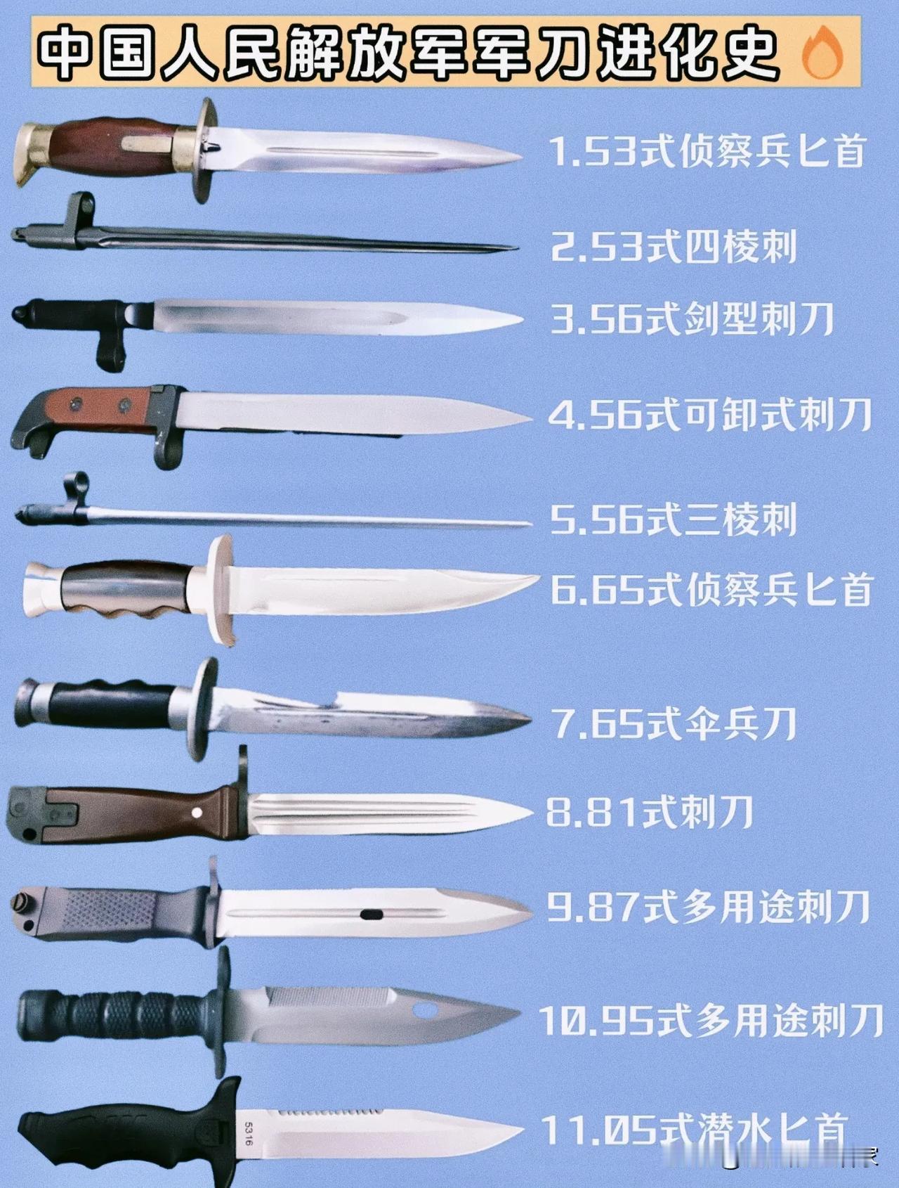 从“只会捅”到“全能手”:11把军刀,看懂解放军70年的“刀刃哲学”🔥 你有没有想过,一把军刀的进化史,其实就是一支军队从“求生存”到“谋打赢”的缩影?这11把中国军刀,藏着比你想象中更硬核的故事。 一、50-60年代:苏式血脉里的“生存刚需” 53式侦察兵匕首是新中国第一把制式军刀,朝鲜战场上的侦察兵,终于告别了缴获、自制的杂乱装备。它没有花里胡哨的设计,双锋刃、木柄护手,就是为了近距离无声杀敌而生。 而同期的53式四棱刺和56式三棱刺,更是把“极致刺杀”做到了极致。尤其是56式三棱刺,三面血槽+三角形创口,刺中后根本没法按压止血,被军迷戏称为“放血神器”。但这也暴露了致命缺陷:除了捅人,它砍不动藤蔓、割不开绳索,在越南的丛林里,士兵们只能用它“捅空气”,连路都开不了。 这一时期的军刀,像极了刚起步的我们:目标明确,但功能单一,只能解决“有没有”的问题。 二、70-80年代:实战倒逼的“功能觉醒” 对越自卫反击战打醒了所有人:刺刀不是“一次性捅人工具”,它得是士兵的“万能助手”。 65式伞兵刀和65式侦察兵匕首,开始兼顾生存需求;81式刺刀则是关键转折点——它终于不再是三棱的“穿刺怪”,十字形刀身+四道血槽,既能刺杀也能劈砍,甚至能当撬棍用。 更有意思的是87式多用途刺刀,它第一次把“多用途”写进了名字:刀身开刃、刀鞘带剪线器,士兵终于不用再拿刺刀当“开瓶器”“锯子”了。这像极了改革开放初期的中国:不再死磕单一指标,开始学着“多面手”。 三、90年代至今:从“杀器”到“生存伙伴” 95式多用途刺刀的出现,彻底改写了中国军刀的定义。它参考了世界先进设计,刀身有锯齿、刀鞘带磨刀石,能剪铁丝网、锯钢筋、开罐头,甚至刀柄里还藏着指南针。到了05式潜水匕首,更是为特种作战量身打造,刀背带锯齿、刀尖带破甲尖,既能水下切割渔网,也能近距离格斗。 从“只会捅”到“啥都能干”,这背后是战争形态的变化:近战拼刺越来越少,野外生存、特种渗透、工程作业越来越多。军刀不再是单纯的“凶器”,而是士兵的“生存伙伴”。 🔄最后想说的话 很多人迷恋三棱刺的“传说”,却忽略了它被淘汰的根本原因:功能单一的极致,就是落后。我们的军刀进化史,从来不是“越锋利越好”,而是“越实用越强”。 从仿苏制的“生存刚需”,到实战倒逼的“功能觉醒”,再到现代战争的“全能伙伴”,这11把刀,就是一部微缩的中国军队现代化史。 你最喜欢哪一把?评论区聊聊你的看法👇