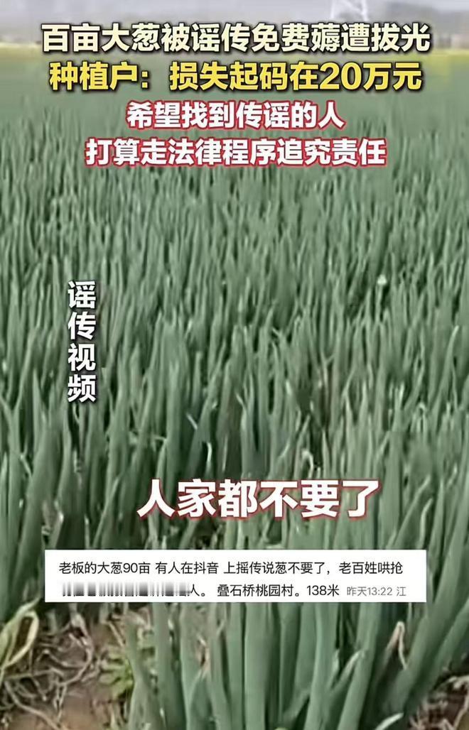 为了涨几个粉丝,把农民一年的辛苦钱给毁了,这事儿发生在江苏南通。 一个女的路过葱地,拍个视频喊“免费拿”,结果几百号人冲进去连拔带踩,种植户损失上万块。 但这事儿最让人后背发凉的,不是那个造谣的女的被拘留了,而是后面跟着起哄的那20多个人。 你以为他们只是随手转个发?其实他们每个人都在给这场“抢劫”递刀子。 警方通报里写得清清楚楚,除了始作俑者,还有20多个转发视频的人也被行政处罚了。 奇怪的地方在于:为什么很多人觉得“转发”就不算作恶? 好像只要不是我第一个编的,我只是“顺手”发一下,我就没责任。 问题是,那个种葱的大爷认识你吗? 他一年的收成,凭什么要为你们这20多人的“手滑”买单? 造谣的那个女的是坏,但这20多个跟风的人,是蠢,也是恶。 他们哪怕有一秒钟想过“这葱是不是人家的”,这场哄抢都不会发生。 现在好了,一个进去蹲着,20多个背上处罚记录。 为了那点流量,或者为了那点免费的大葱,搭上自己的征信和前途。 这事儿最讽刺的地方就在于,那些冲进地里拔葱的人,可能平时在朋友圈里也是个转发“正能量”的好公民。